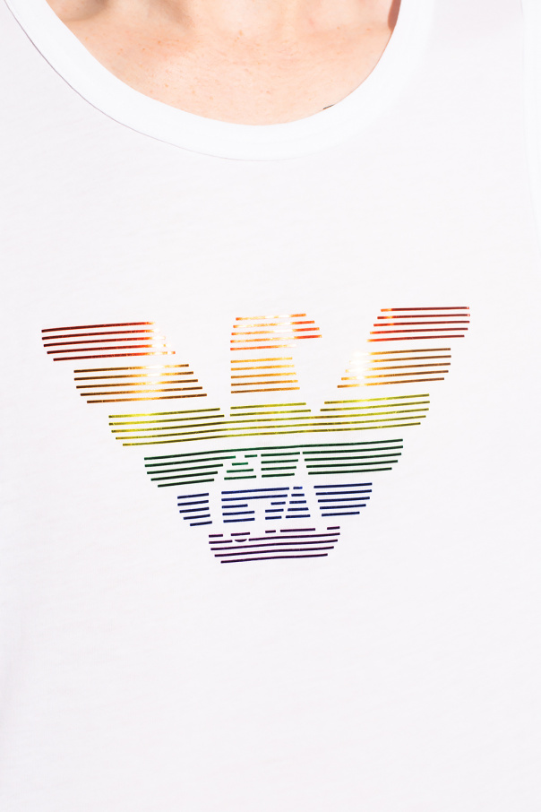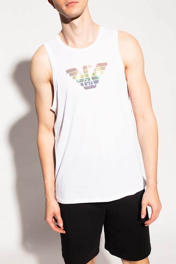 White crewneck tank top from Emporio Armani. Crafted from cotton, this style showcases a colourful logo appliqué and an elasticated collar.