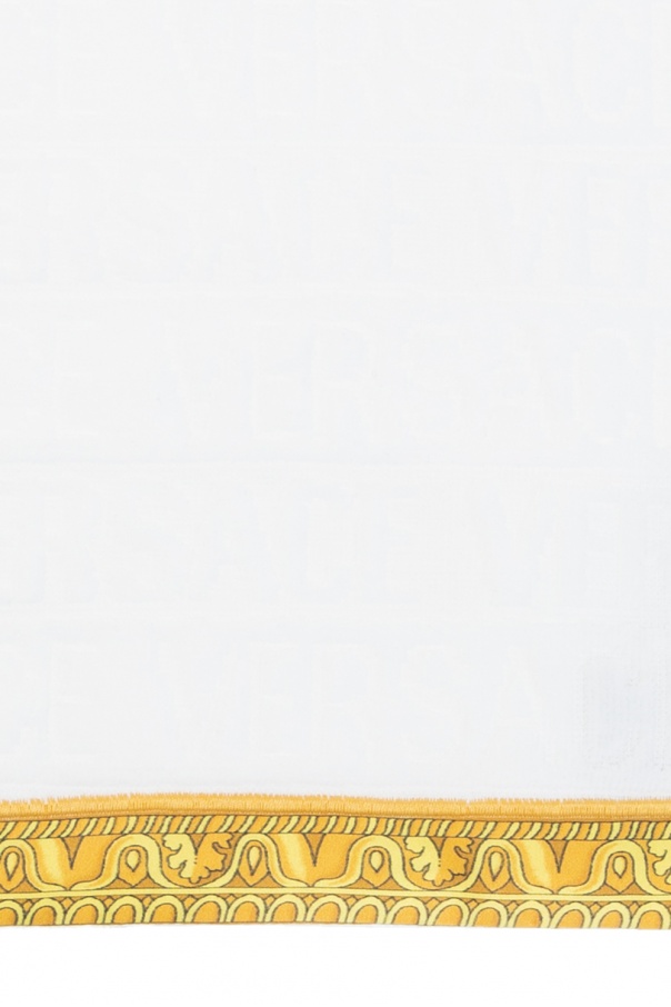 White towel from Versace Home. Crafted from cotton, this item is decorated with an embroidered logo pattern and silk trims with the iconic Baroque print in yellow and black.