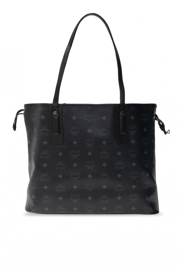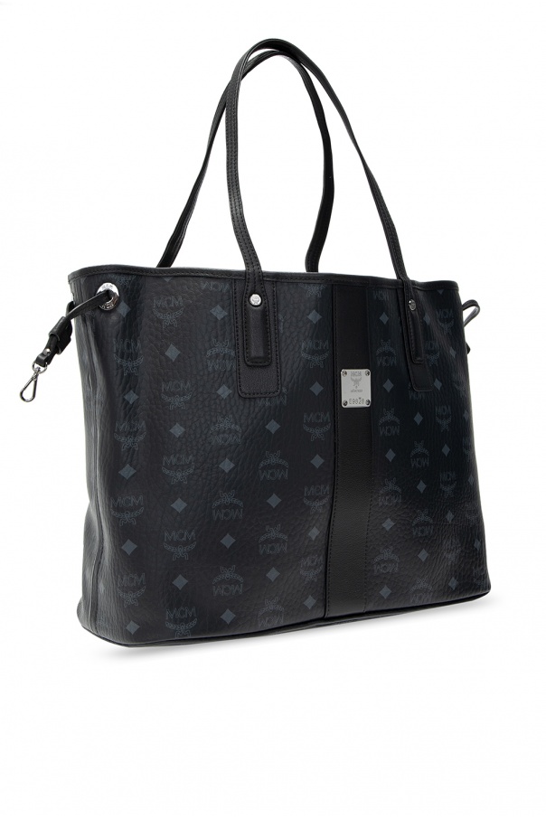 Black tote bag from MCM. Made of the brand’s iconic canvas with leather trims, this item features a printed logo pattern in grey, a metal logo detail, two half-round handles, one internal compartment and metal hardware plated with 14 carat gold. Comes with a zipped pouch.