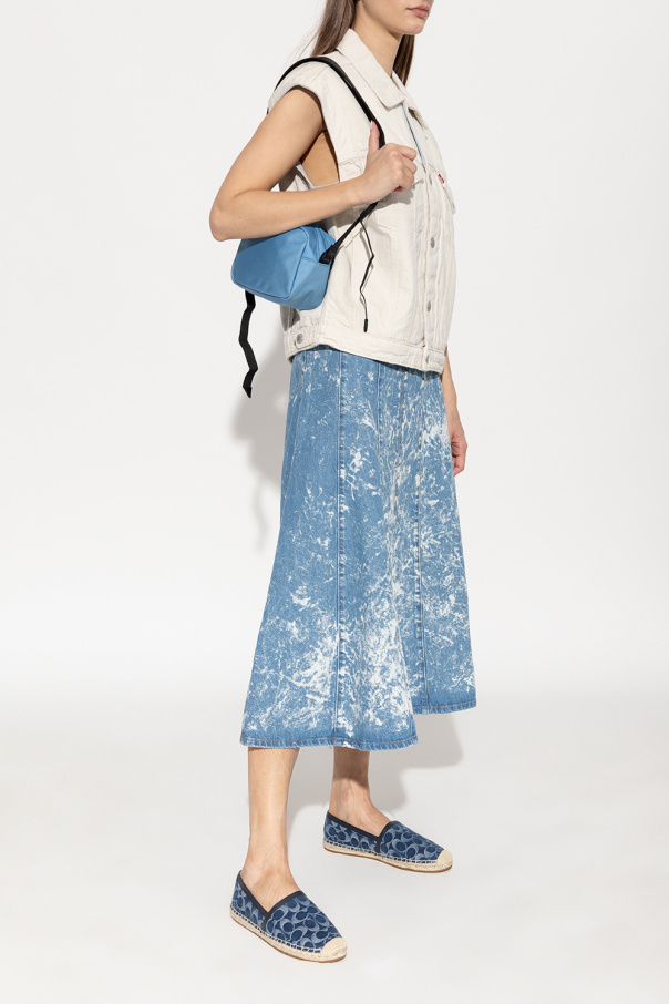 Navy blue and white ‘Collins’ espadrilles from Coach. Made of leather and fabric, this model sits in a beige rubber sole with a jute overlay and showcases the brand's ‘C’ monogram pattern.