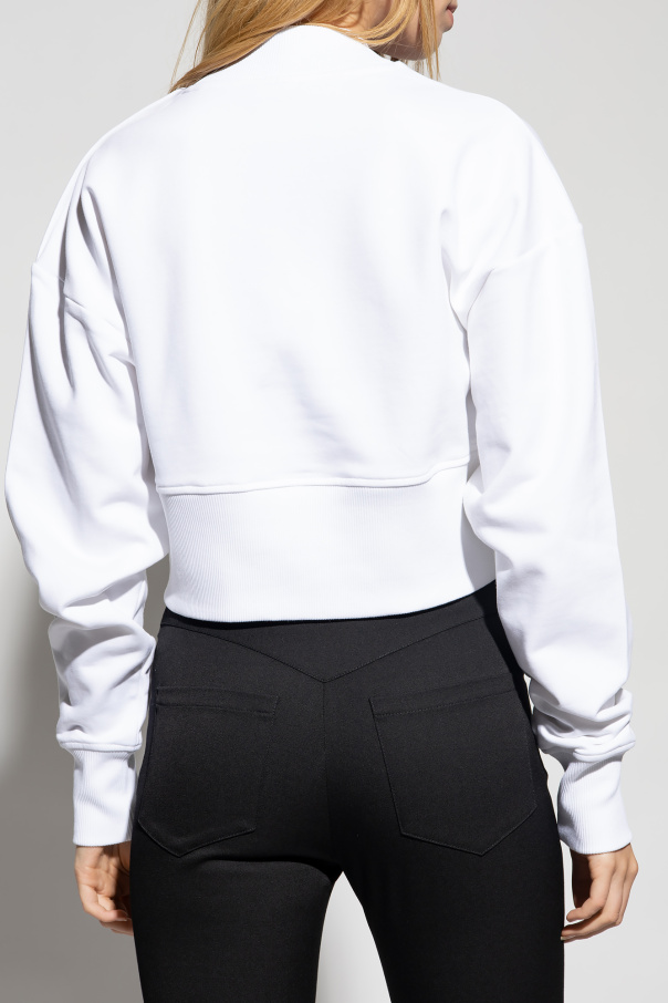 White crewneck sweatshirt from Balmain. Crafted from cotton, this style features a black graphic print with the brand's logo, decorative gold-tone buttons on the shoulder and ribbing on the collar, bottom hem and long sleeves.