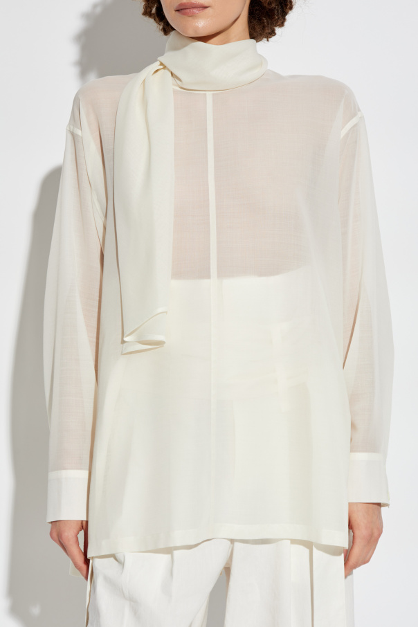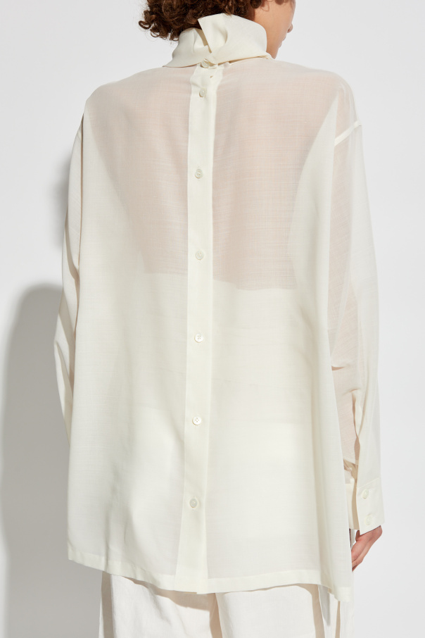 Introducing the Decorative Neckline Top by the illustrious designer Issey Miyake. This exquisite white top embodies elegance and sophistication, perfect for formal gatherings or refined outings. Crafted from a luxurious blend of wool and polyester, the fabric is both lightweight and breathable, ensuring unmatched comfort. The top features a loose fit that gracefully flows to the hips, accentuated by long sleeves with wide cuffs, each secured with delicate buttons. A decorative neckline with a broad collar and a versatile tie adds a touch of finesse, allowing for various styling options. The back is adorned with a vertical row of buttons, providing both functionality and an elegant aesthetic. The slightly sheer material enhances the top's ethereal quality, making it an indispensable addition to any sophisticated wardrobe. Why Choose This Product? Timeless Elegance: A classic piece designed by the renowned Issey Miyake, known for his innovative and artistic designs. High-Quality Materials: Made from a premium blend of wool and polyester, ensuring durability and comfort. Versatile Styling: The decorative collar and tie offer multiple styling options, enhancing its versatility. Attention to Detail: Features such as wide cuffs and a button-down back add a sophisticated touch. Light and Airy: The slightly sheer material exudes elegance and adds a delicate charm.