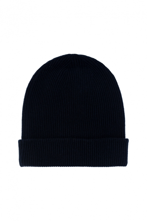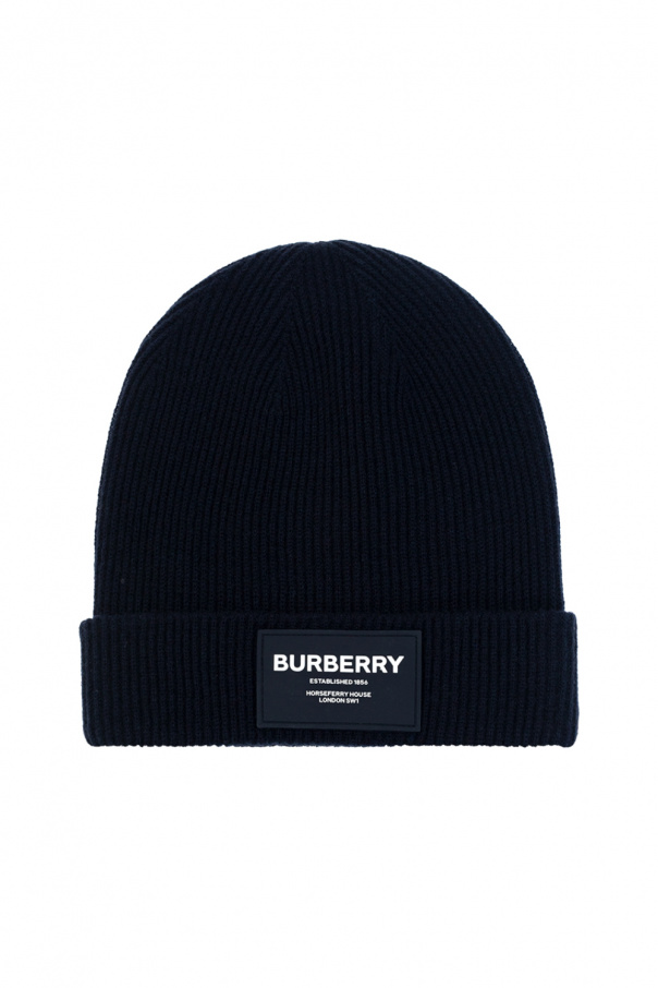 Navy blue beanie from Burberry Kids. Crafted from a wool and cashmere blend, this item features a white rubber logo patch and a ribbed hem.