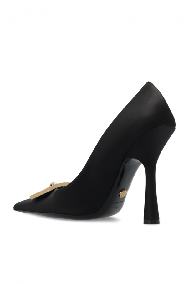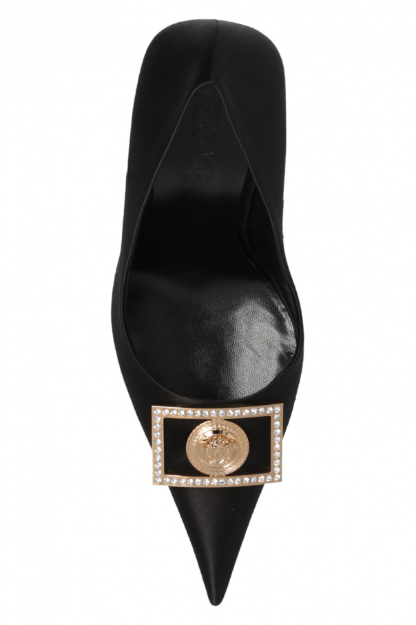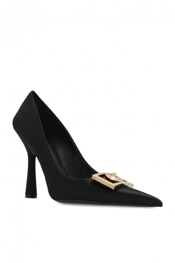 Black ‘Medusa’ pumps from Versace. Made of satin, this model showcases a pointed toe silhouette, a black leather sole and gold-tone brass hardware with the brand's signature Medusa detail bejewelled with crystals on the front.