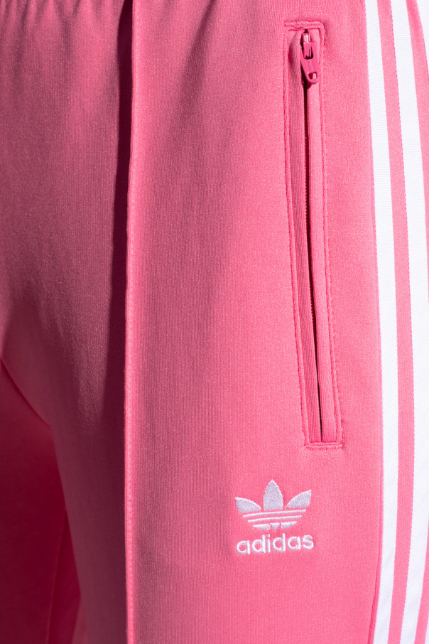 Pink sweatpants from ADIDAS Originals. Crafted from Primeblue – a high-quality recycled fabric partly made with Parley Ocean Plastic, this pair falls down with tapered legs and features a drawstring waist, two zipped pockets on the front, stitching details, zipped cuffs as well as an embroidered white logo and the brand's signature three stripes in white.