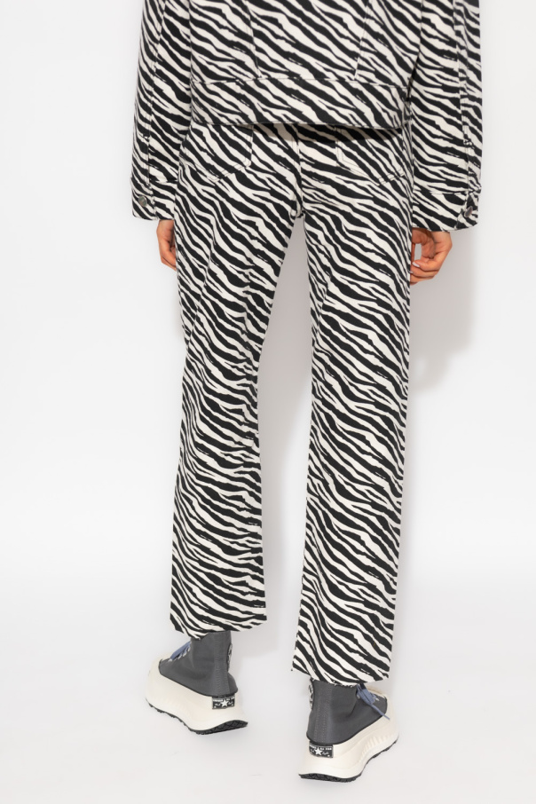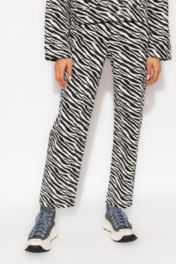 Black and white ‘Gia’ jeans from Notes Du Nord. Embellished with an animal motif, this pair falls with slightly tapered legs and features a zip fly with a button, classic five pockets, frayed hems and a back logo patch.