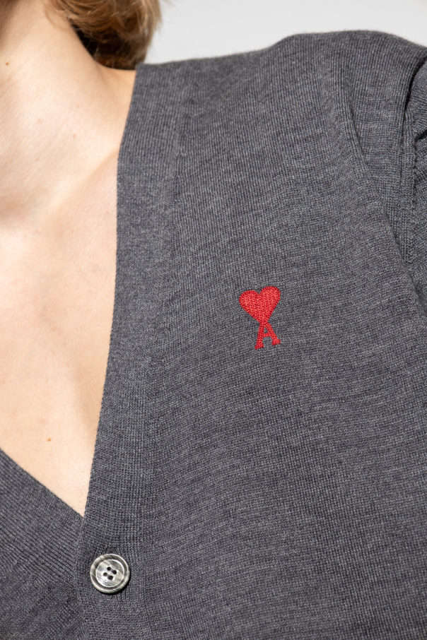 Dark grey cardigan from Ami Alexandre Mattiussi. Crafted from a merino wool blend with the RWS certificate, this design features button fastenings, a red Ami de Coeur logo embroidery and ribbed trims at the hem and cuffs.