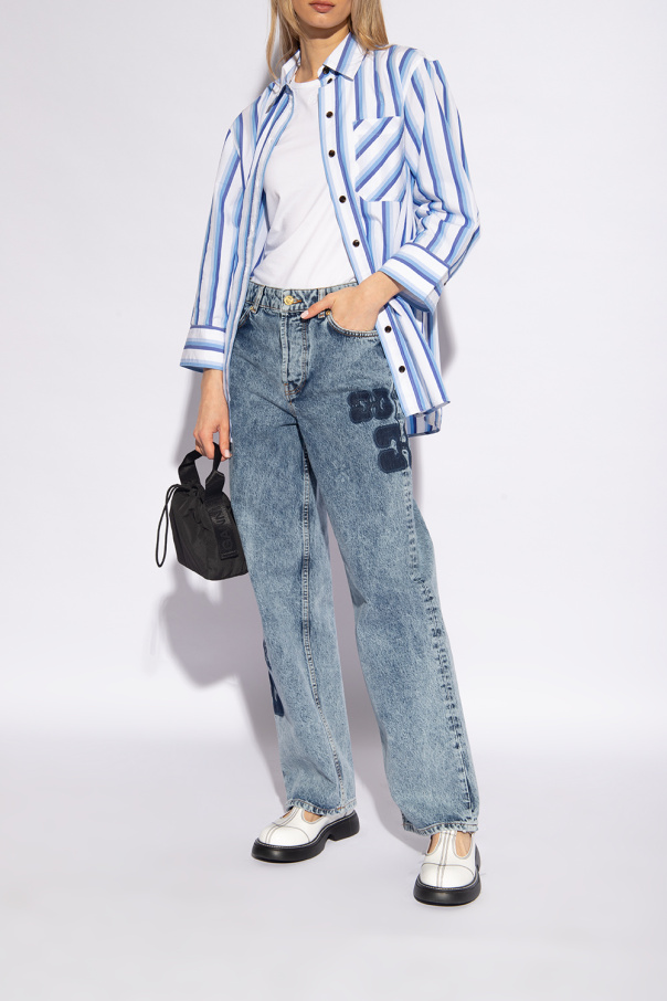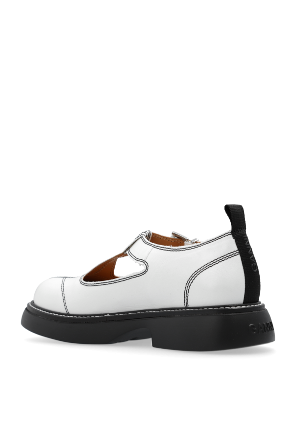 Introducing the Ganni Stitched Zip-Up Shoes, a masterpiece of modern elegance and comfort. These shoes feature a pristine white color complemented by sophisticated black accents around the sole's perimeter and the strap closure. The classic, elegant shape with a rounded toe and distinctive black stitching highlight the shoe's design and construction, making it a standout piece. Made from high-gloss, smooth leather, these shoes exude luxury while ensuring durability. The details include a strap with a metal buckle and a zip closure at the ankle for a secure fit, along with a black loop at the heel for ease of wearing. The designer's logo, subtly placed on the side near the sole, marks the craftsmanship of Ganni. The flat and relatively thick sole indicates stability and comfort, making these shoes perfect for various occasions. The interior, crafted from a contrasting natural shade of leather, adds an extra layer of sophistication. Why buy this product? Elegant design with unique black stitching and high-gloss finish. Luxurious, high-quality leather material. Comfortable and stable wear thanks to the thick, flat sole. Exclusive details like the metal buckle closure and designer logo.
