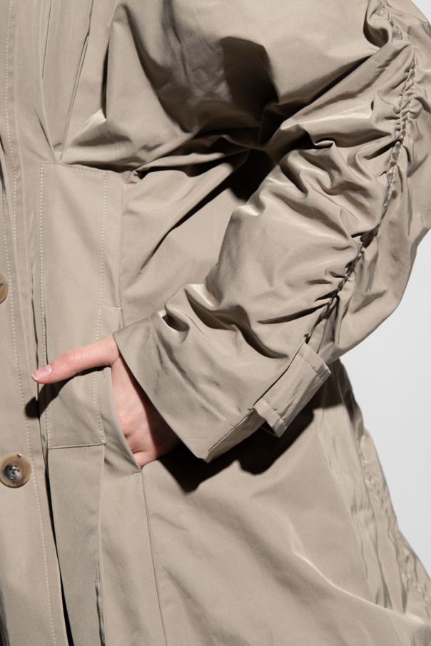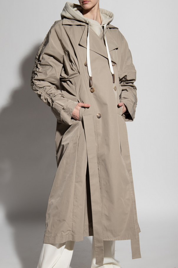 Beige double-breasted trench coat from Ambush. Made from a cotton blend, this style fastens via buttons and features a waist-cinching belt and long, gathered sleeves with button straps.