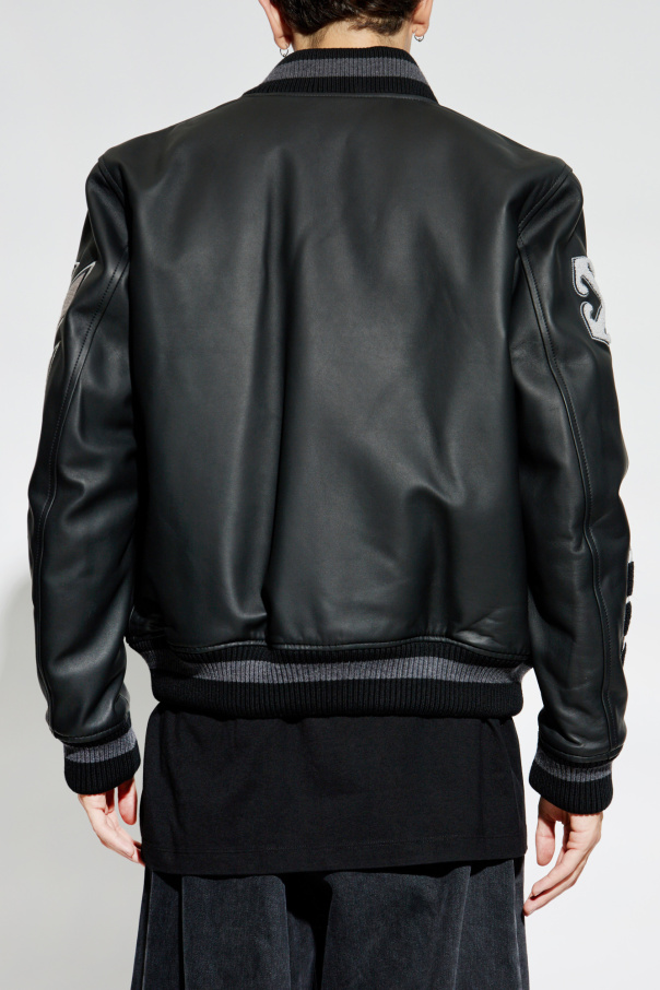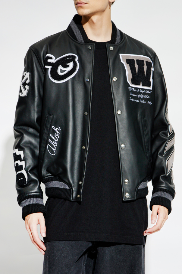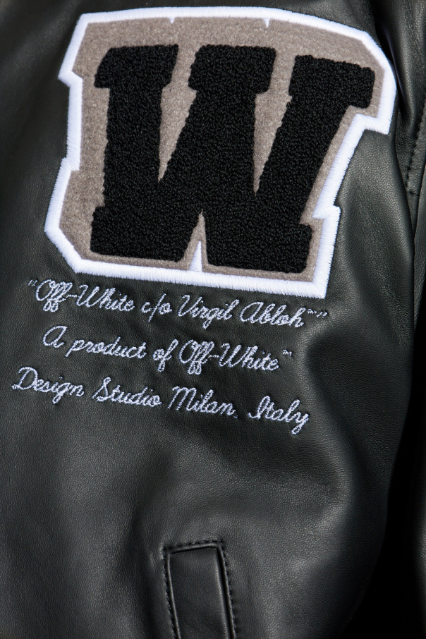 Introducing the Logo Jacket from the esteemed Off-White brand, a paragon of sartorial excellence. This classic bomber jacket, crafted from luxurious black leather, epitomizes both sophistication and contemporary flair. The jacket is adorned with an array of intricate embroideries and patches, meticulously placed to enhance its unique character. Featuring a relaxed silhouette, the jacket boasts notable details such as the large "W" patch on the left shoulder with "Off-White c/o Virgil Abloh" inscription, a commanding "OFF" logo on the right chest, and a prominent "Abloh" motif on the right sleeve. The elasticized cuffs, collar, and hem, accented with white stripes, ensure a snug and comfortable fit. Constructed from a blend of premium materials including cupro, leather, cotton, and viscose, this piece is as durable as it is stylish. The jacket fastens with robust snaps and includes dual snap-closure pockets for added functionality. The attention to detail is evident in every stitch, making this a truly exclusive item. Why purchase this product? Timeless bomber jacket design High-quality black leather for an elegant look Distinctive embroideries and patches Elasticized trims for improved fit and comfort Functional snap-closure pockets