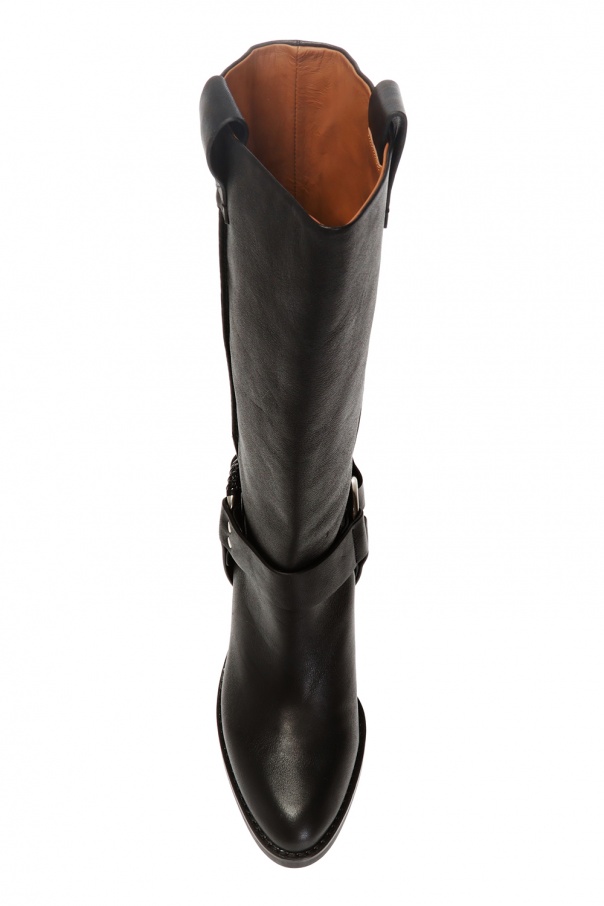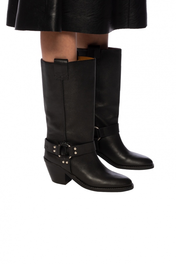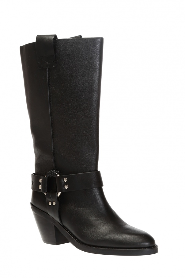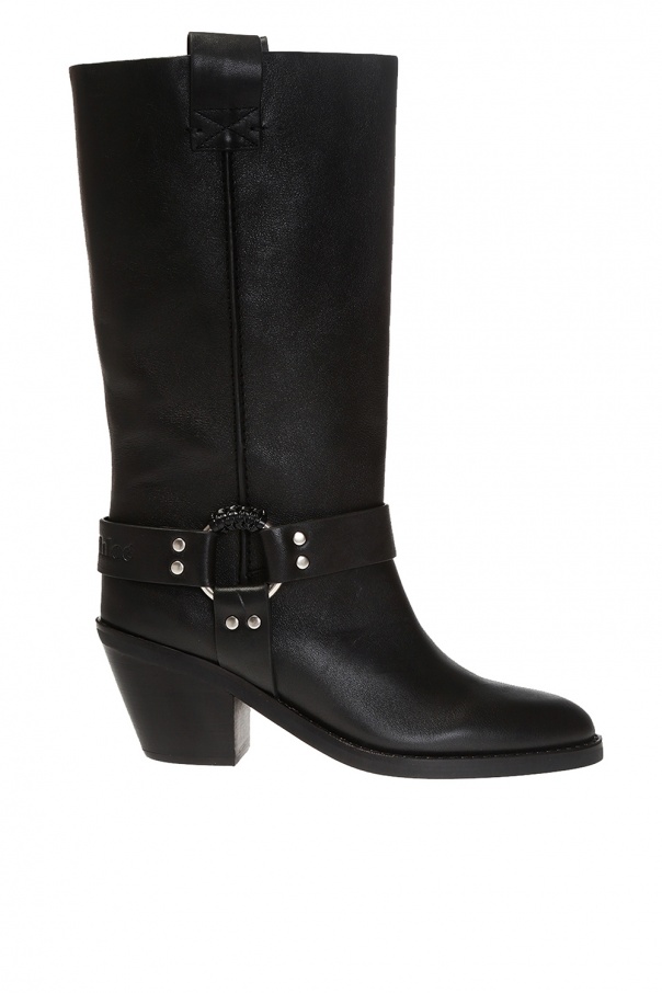 Black heeled boots from See by Chloé. Made of leather. Decorated with leather straps, a round metal applique and an embossed logo. Black rubber sole.