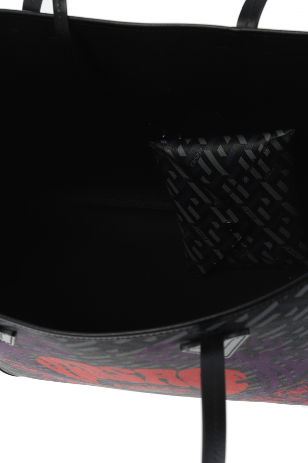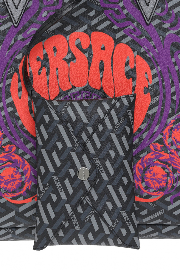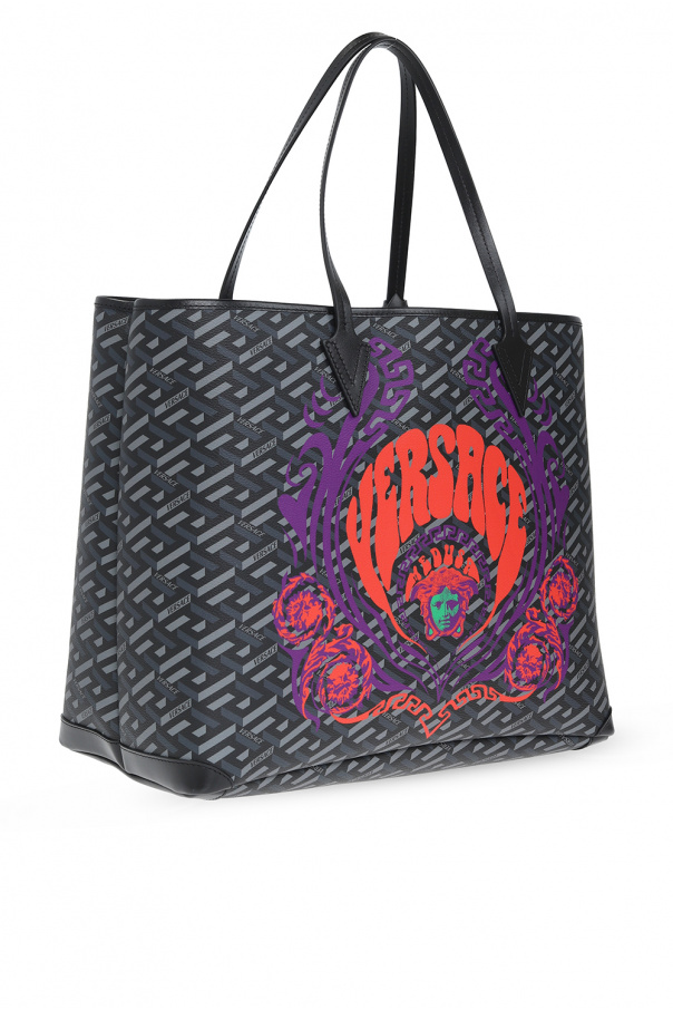 Black and grey ‘Medusa Music’ shopper bag from Versace. This model features the iconic La Greca motif, purple, red and green logo print, detachable snap-fastened pouch, two half-round handles, one internal compartment and silver-tone metal hardware.