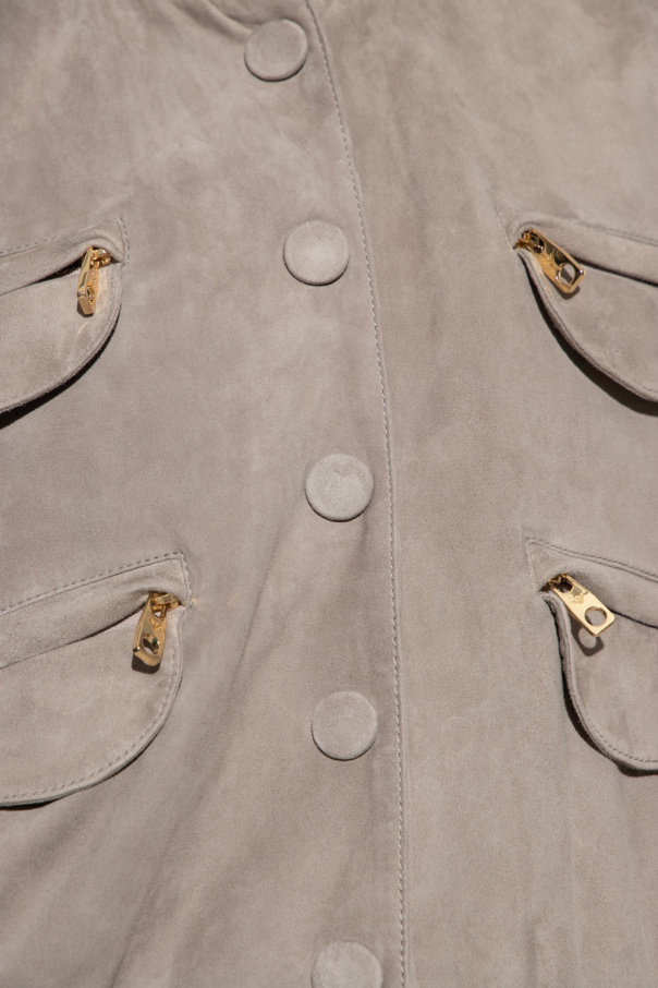 Grey jacket from Emporio Armani. Crafted from leather, this style fastens with a zip and features four zipped pockets and elasticized trims on the standing collar, bottom hem and cuffs.