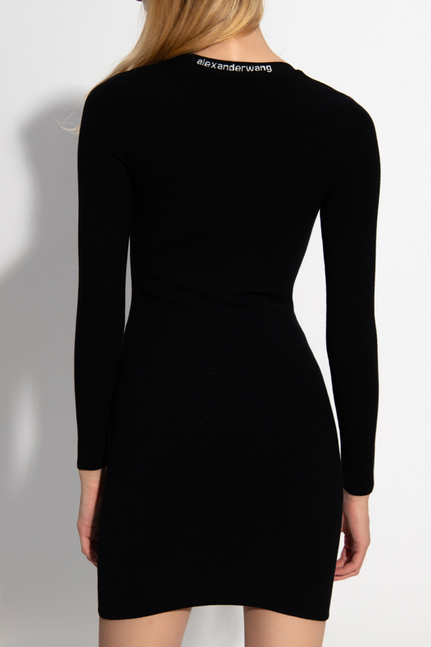 Black dress from T by Alexander Wang. This long sleeve design has ribbed trims embroidered with a white logo.