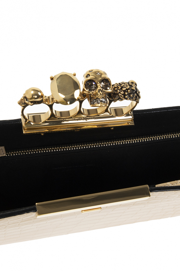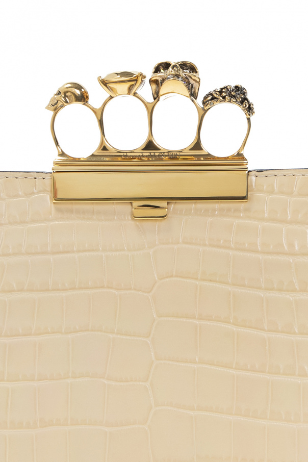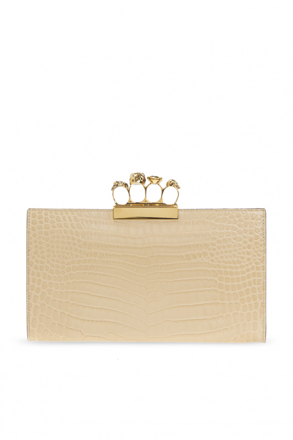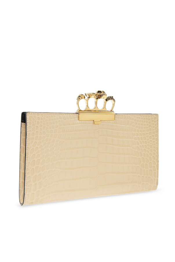 Cream 'Four-Ring' clutch from Alexander McQueen. Made of calf leather with a crocodile skin effect, this model fastens with a snap and has a ring handle with a skull embellished with Swarovski crystals, gold-tone brass hardware and one internal compartment with black suede lining and two zip pockets.