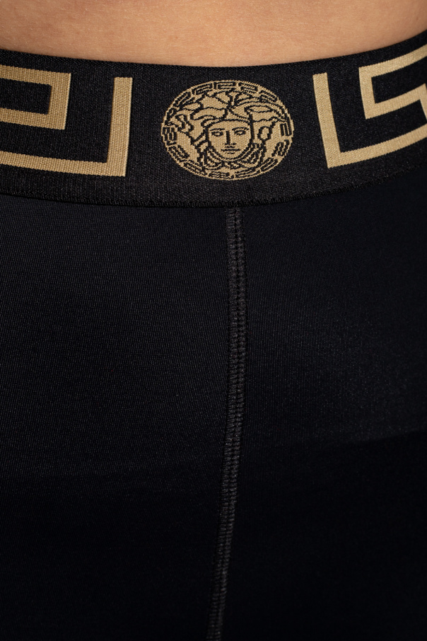 Black short training leggings with an elastic waistband and a logo from Versace.
