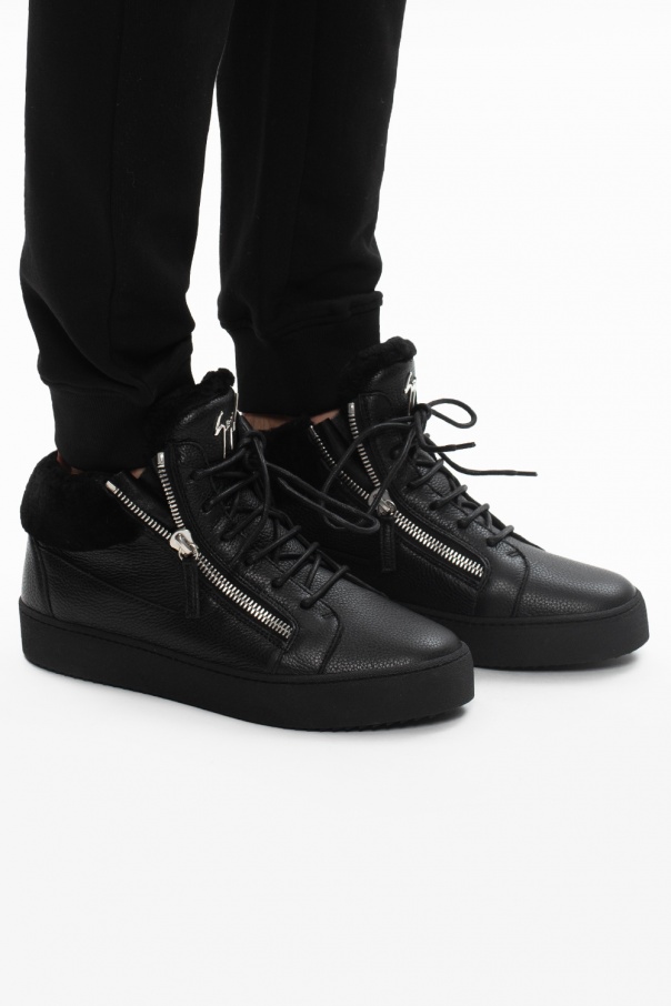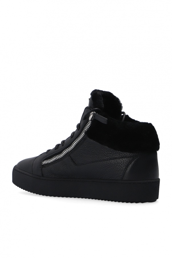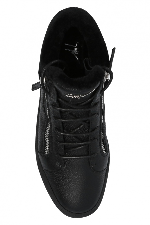 Black ‘May London’ boots from Giuseppe Zanotti. Crafted from leather, this lace-up pair is set on a black rubber sole and showcases extra zip closures, fur lining and silver-tone metalware with logo for the brand recognition.