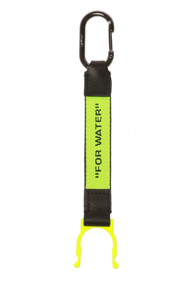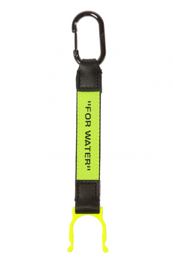 Yellow, black and silver-tone keyring with a bottle holder from Off-White. Carabiner fastening. Trimmed with leather. Decorated with embroidered lettering.