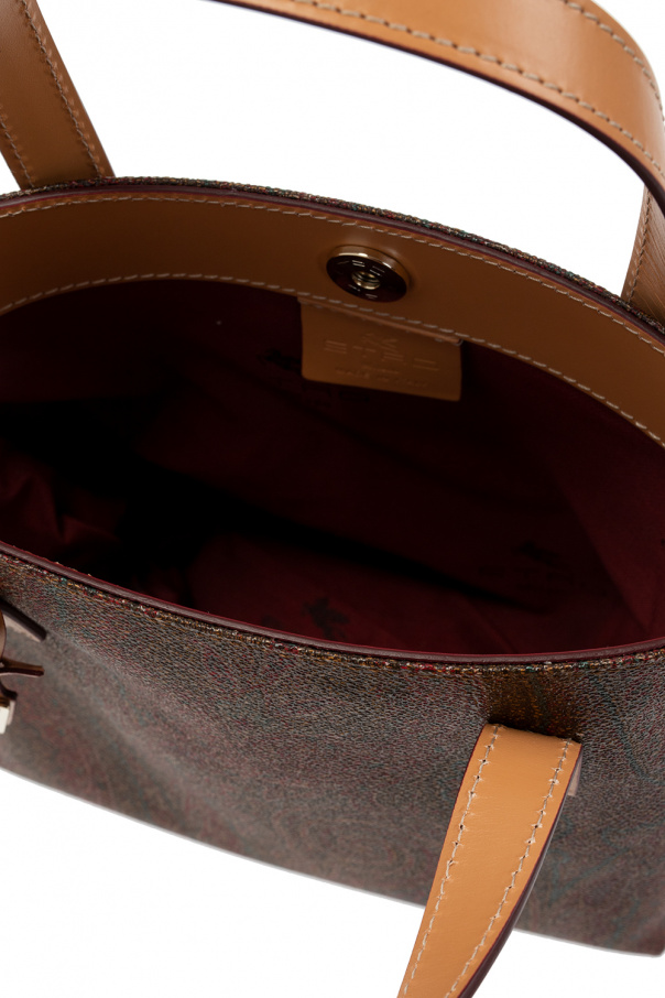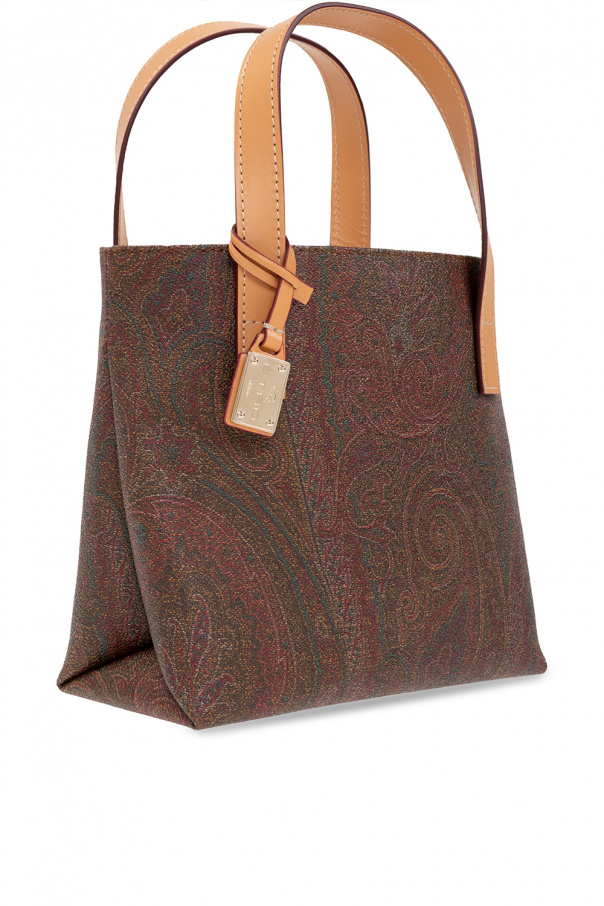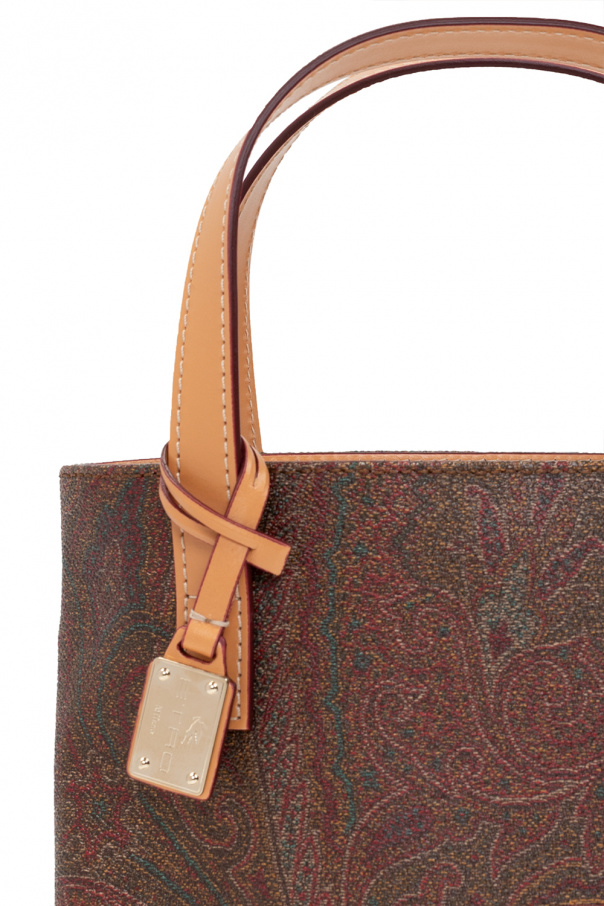Brown and beige hand bag from Etro. Crafted from canvas printed with the brand’s signature paisley motif, this style is complete with a snap fastening, detachable logo appliqué, two half-round handles and one internal compartment with one pocket.