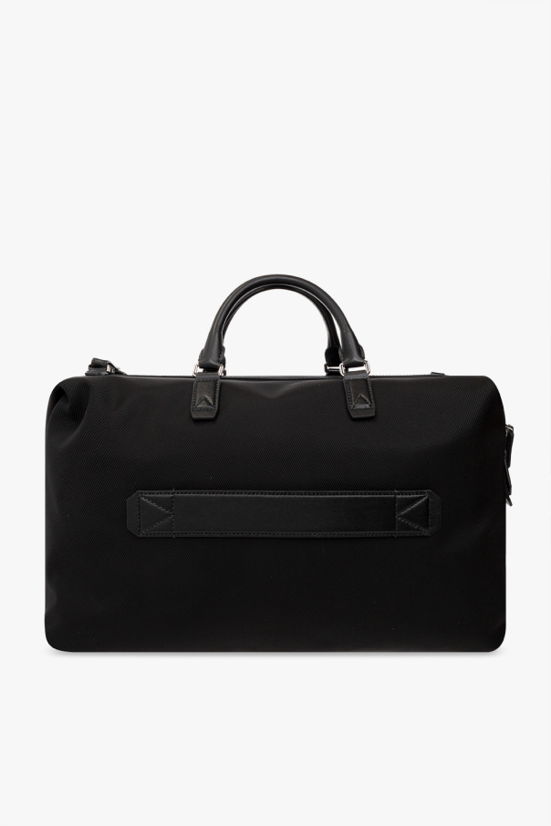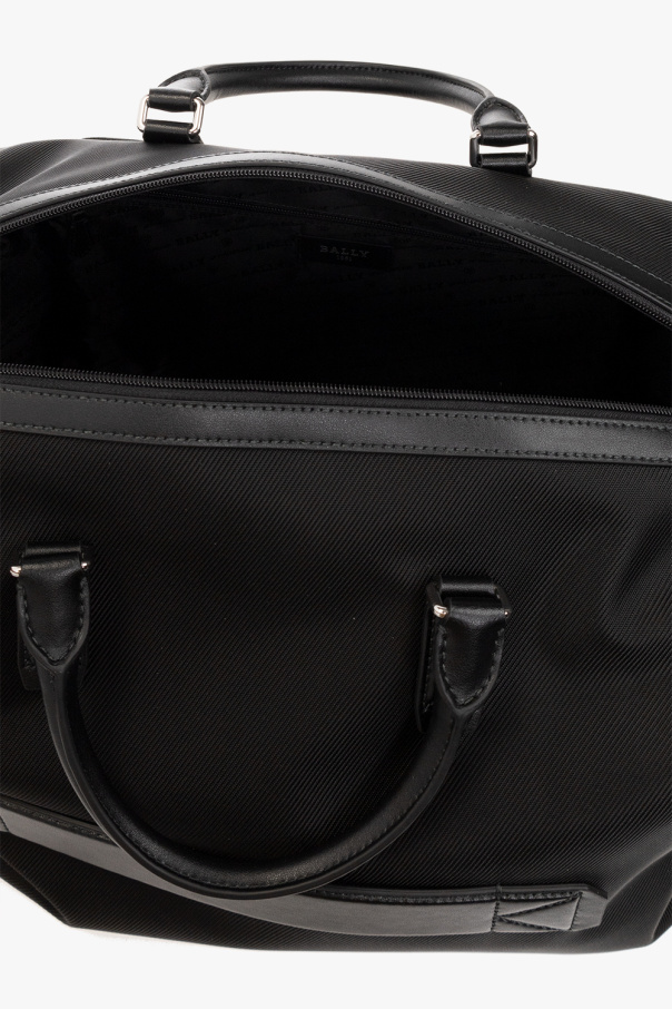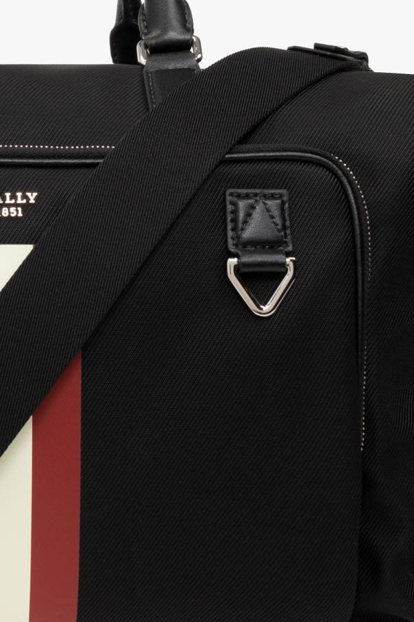 Black ‘Zeedio’ holdall bag from Bally. Made of fabric with leather trimming, this model fastens with a two-way zip and is decorated with the brand’s signature printed stripe in red and white as well as a metal logo detail. It is complete with a front pocket with a two-way zip, handle at the back, two half-round handles, detachable shoulder strap, silver-tone metal hardware and one internal compartment with one zip pocket.