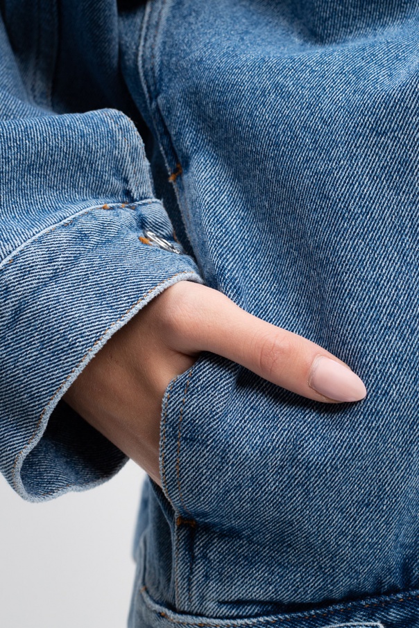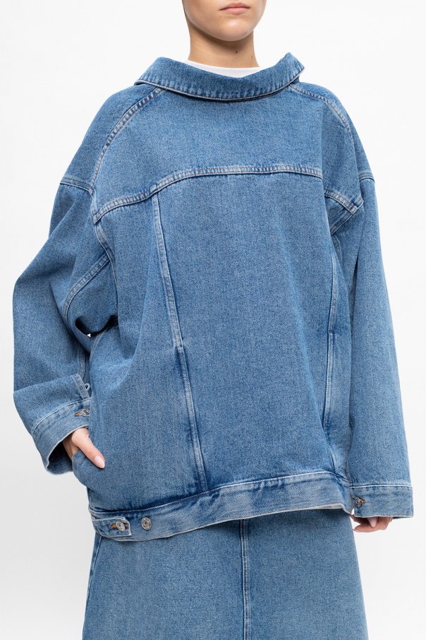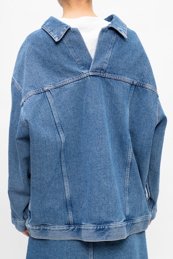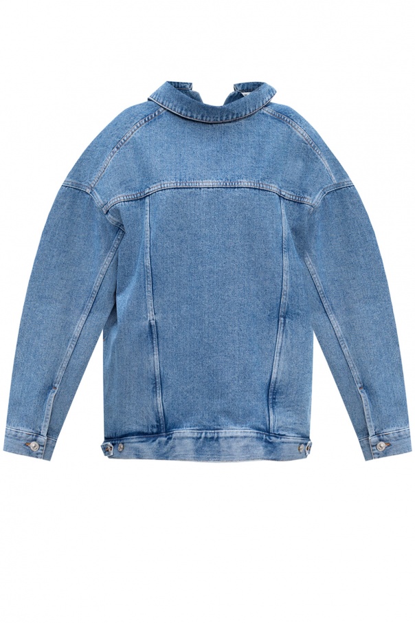 Blue jacket from Balenciaga. Cut from denim, this garment features decorative stitching details, V-neck at the back, silver-tone metal hardware and button fastenings at the cuffs and hem.