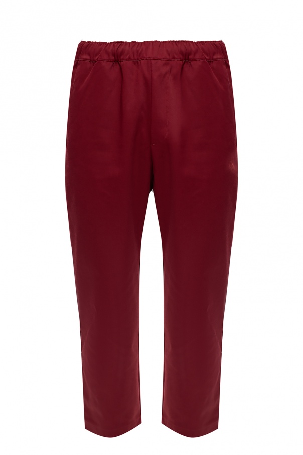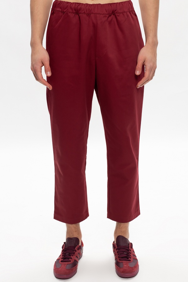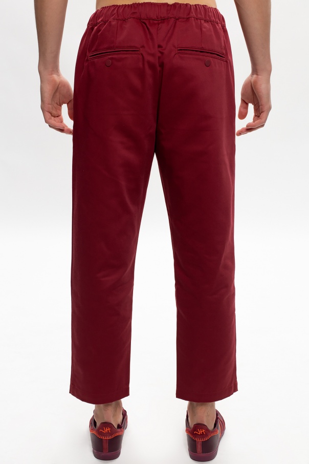 Maroon chino trousers from ADIDAS Originals x Jonah Hill. Boasting relaxed fit embellished with a logo embroidery designed exclusively in partnership with Jonah Hill – an American actor, comedian, writer, director and film producer – this pair falls down with slightly tapered legs and is complete with a drawcord-adjustable waist, two slant front pockets and two button-fastened back pockets.