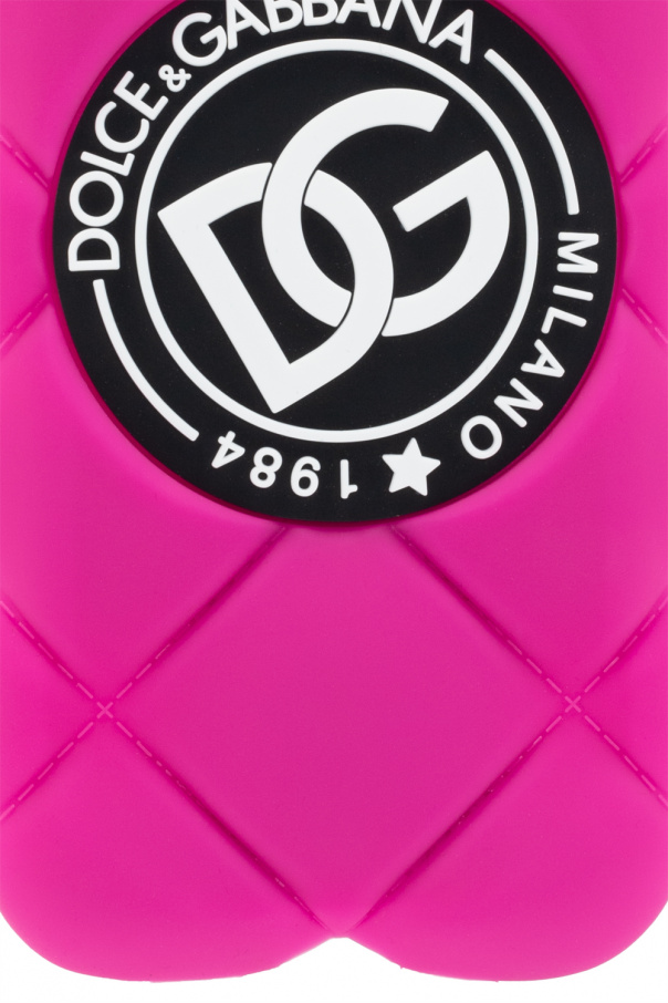 Pink, quilted iPhone 12 Pro case with a raised logo in black and pink from Dolce & Gabbana.