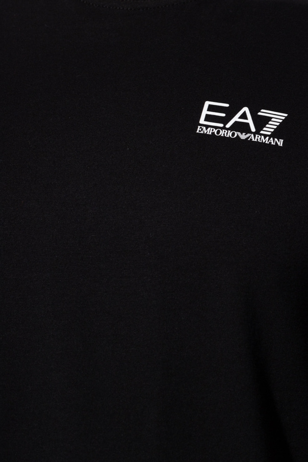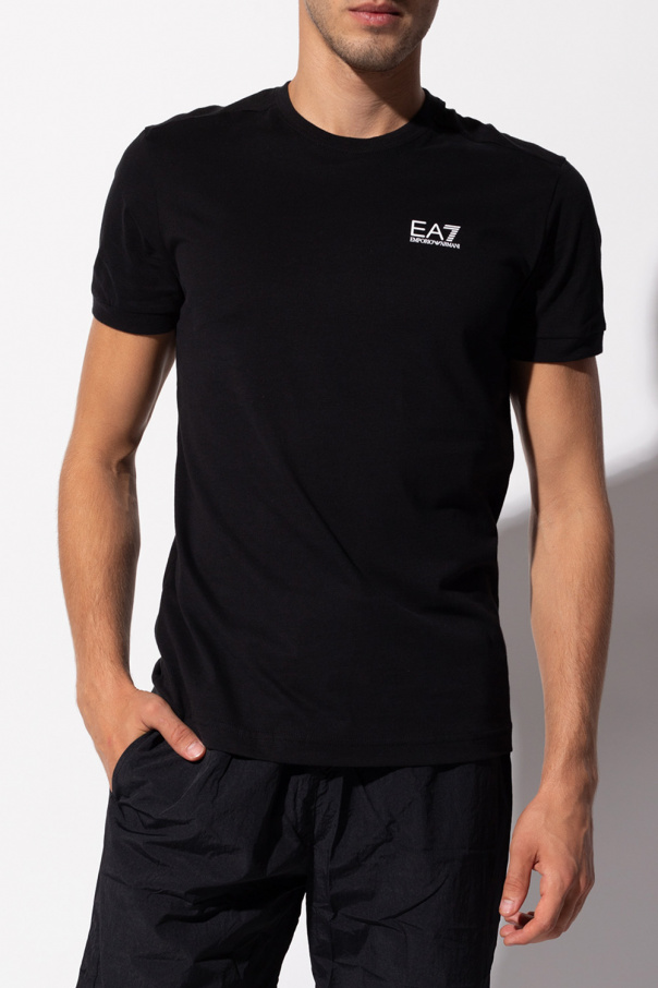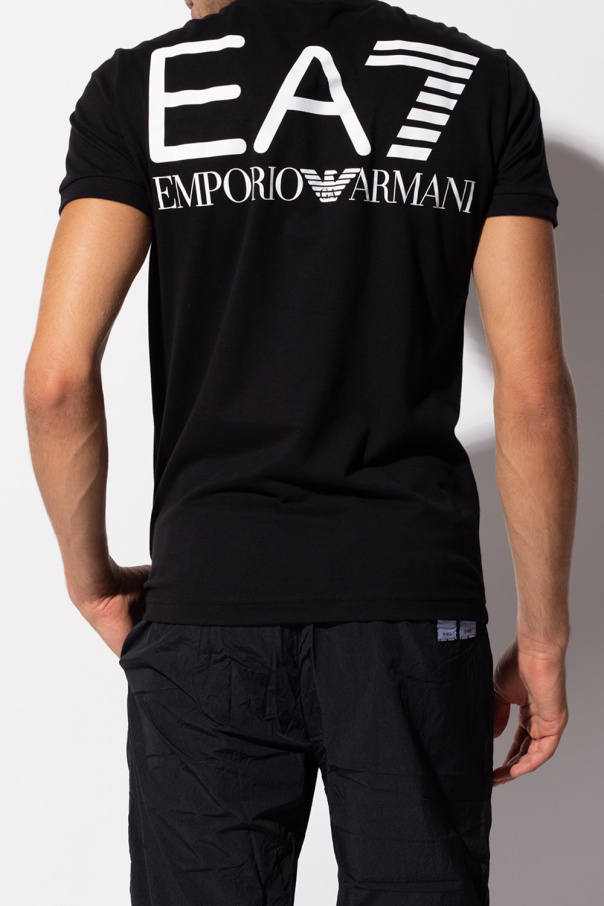 Black crewneck T-shirt from EA7 Emporio Armani. Decorated with a printed logo pattern in white, this garment is complete with ribbed trims at the neck and cuffs.