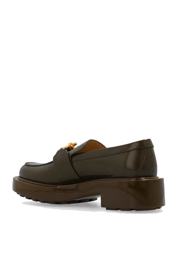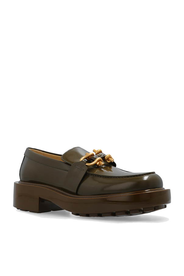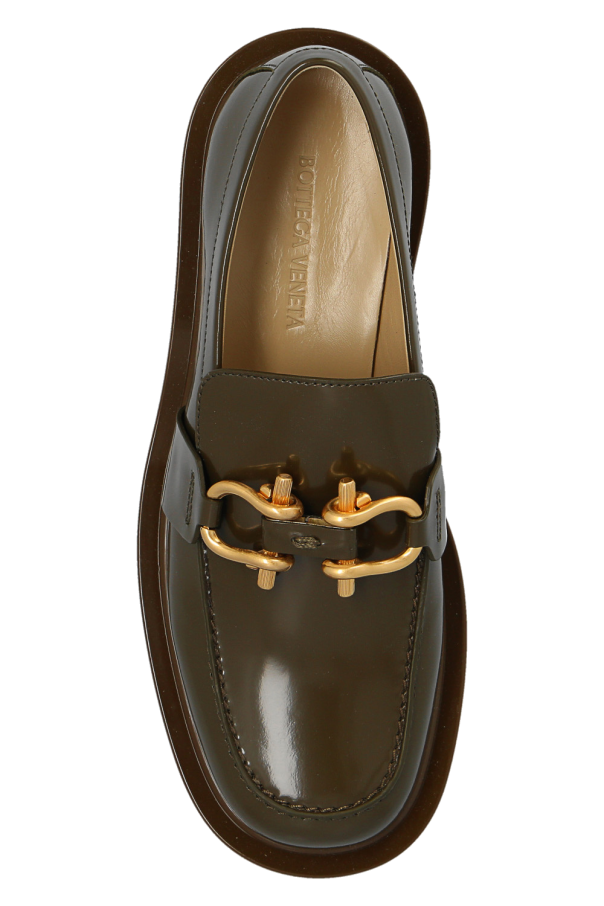 Dark green ‘Monsieur’ loafers from Bottega Veneta. Crafted from leather, this model sits on a dark green rubber sole and showcases a frontal strap with decorative gold-tone hardware.