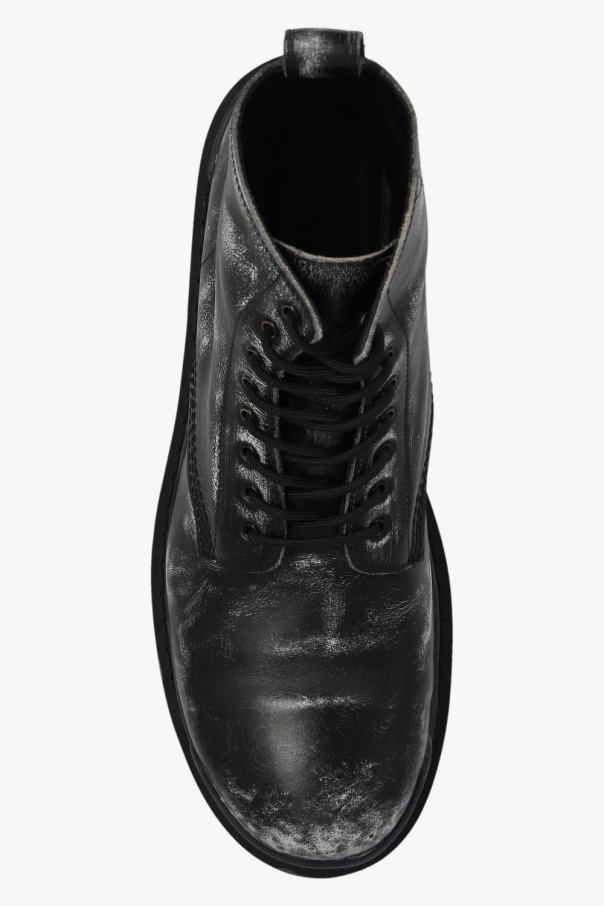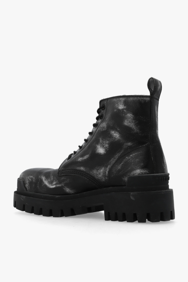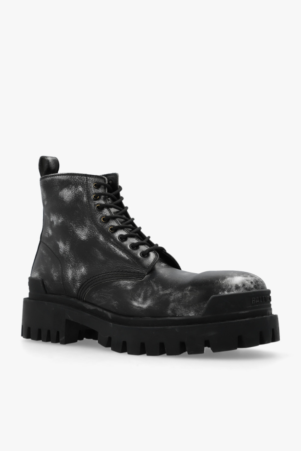 Black ‘Strike’ boots from Balenciaga. Made of leather, this lace-up pair features a worn effect and black rubber sole.