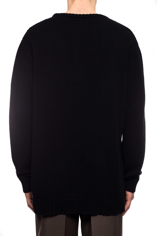 Black woven sweater from Loewe. Made of cotton. Front decorated with a logo embroidery with fringes in white. Round neck. Long sleeves. Elasticated bottom hem and cuffs.