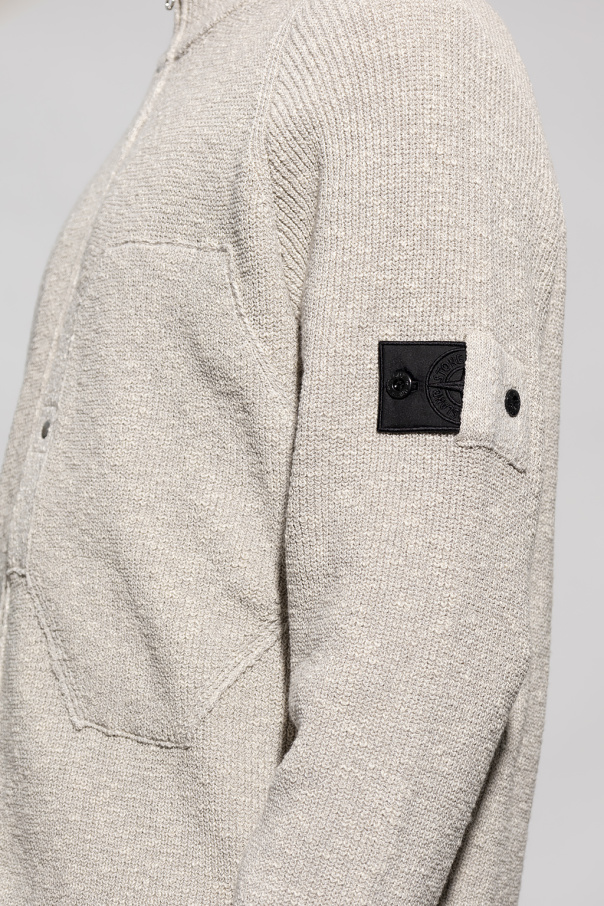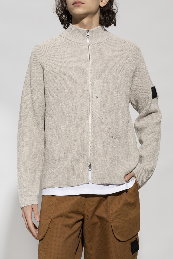 Grey cardigan from Stone Island. Crafted from a linen and cotton blend, this design features a zip fastening, logo patch and ribbed trims at the stand collar, hem and cuffs.