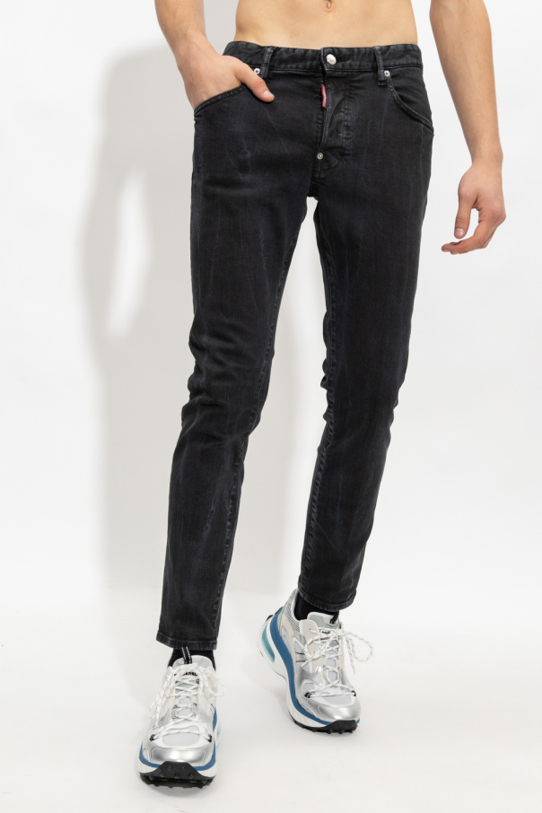 Black ‘Skater’ slim-fit jeans from Dsquared2. Falling with tapered legs, this pair features a vintage effect, button fastenings, classic five pockets and logo patches on the front and back.