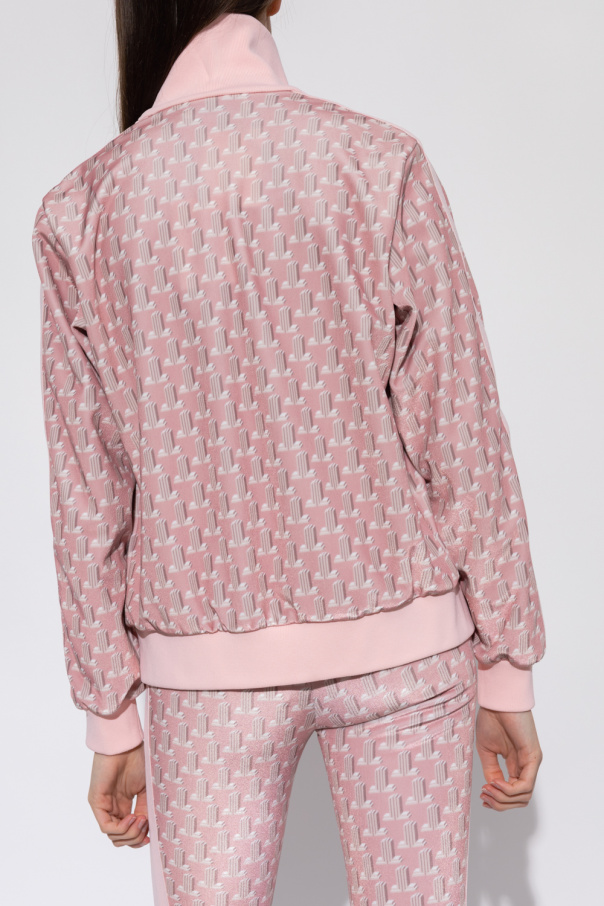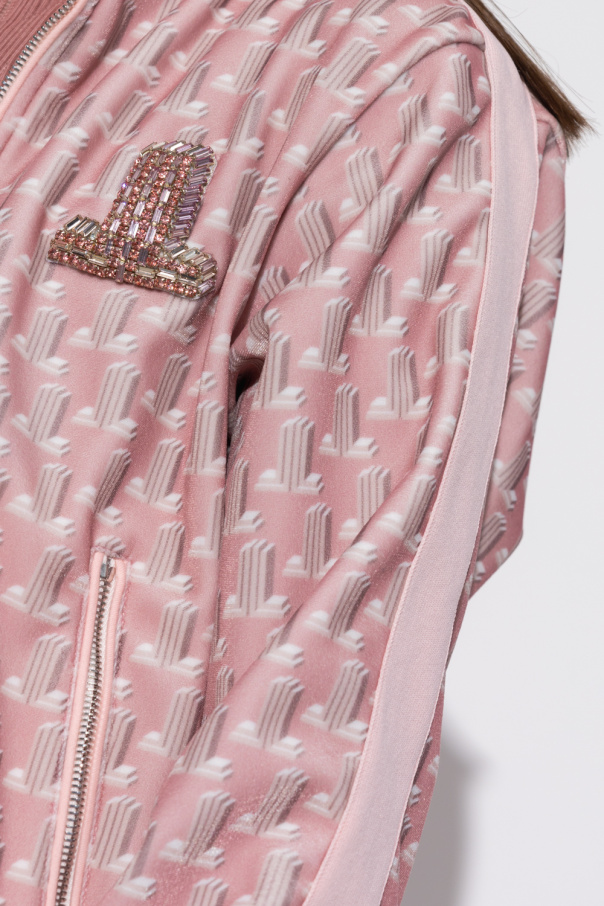 Pink velour sweatshirt with a standing collar from Lanvin. Embellished with the brand's signature ‘3D JL’ pattern in beige and white, this style features a zip fastening, the ‘JL’ appliqué encrusted with sparkling gemstones, and elasticized edges.