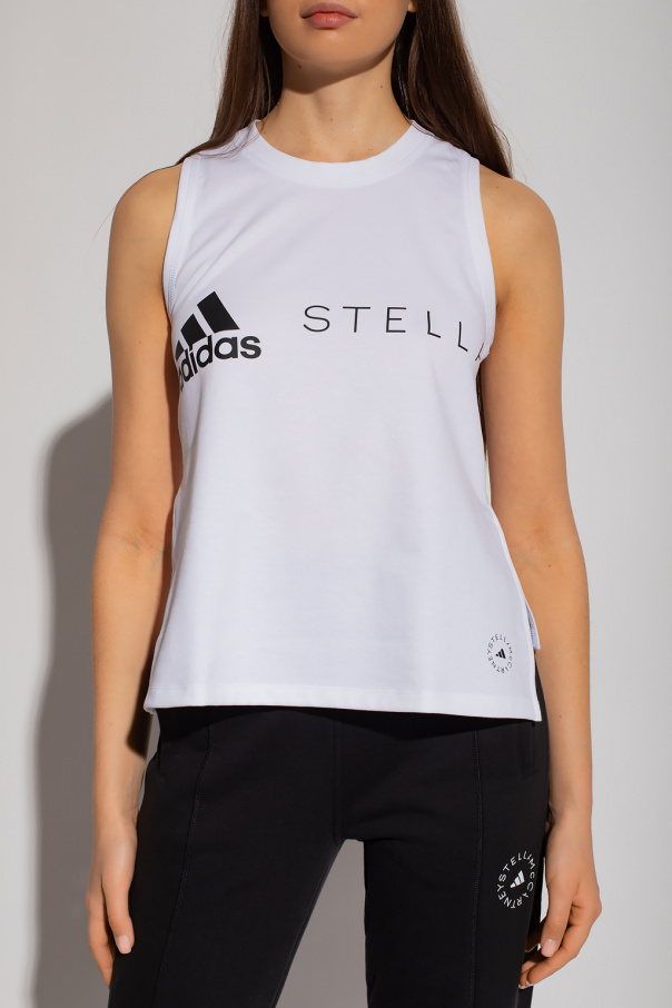 White training tank top from ADIDAS by Stella McCartney. Crafted from a blend including organic cotton, this style features an elasticated round neck, bottom slits and black logo applications on the front and back.