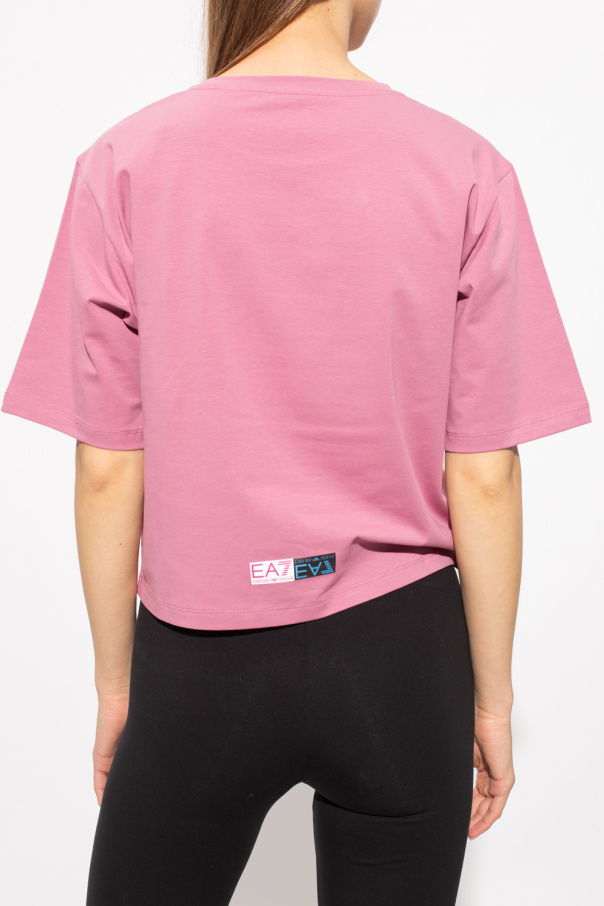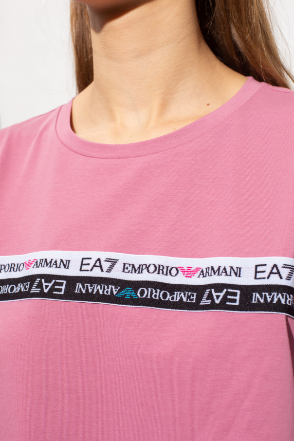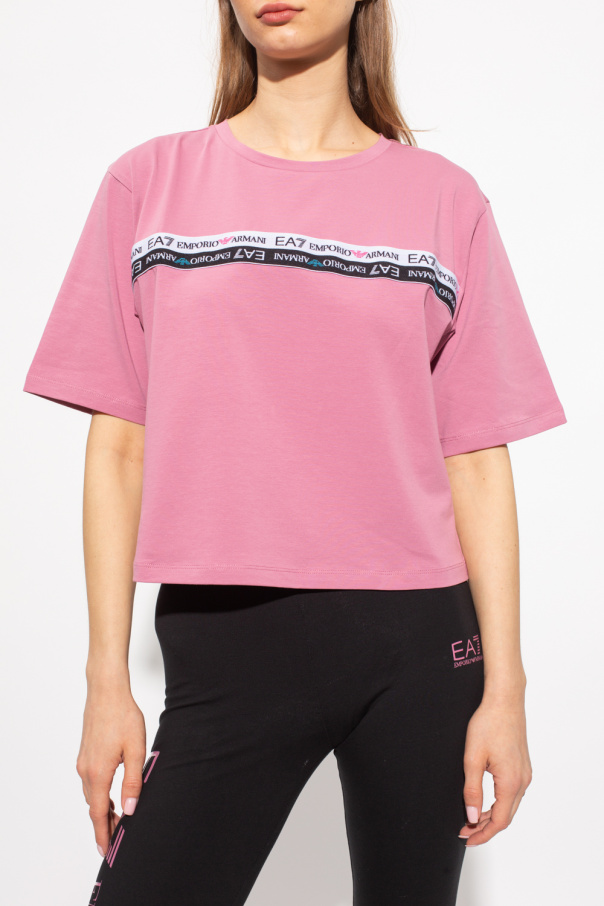 Pink crewneck T-shirt from EA7 Emporio Armani. Crafted from cotton, this short sleeve design features stripe in white and black with a logo.