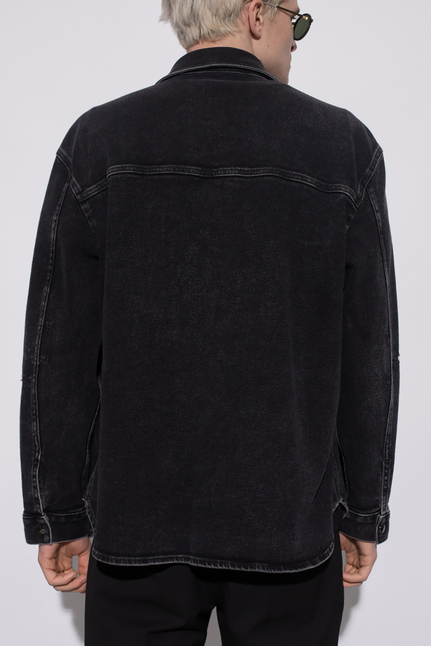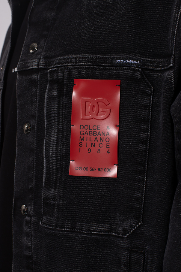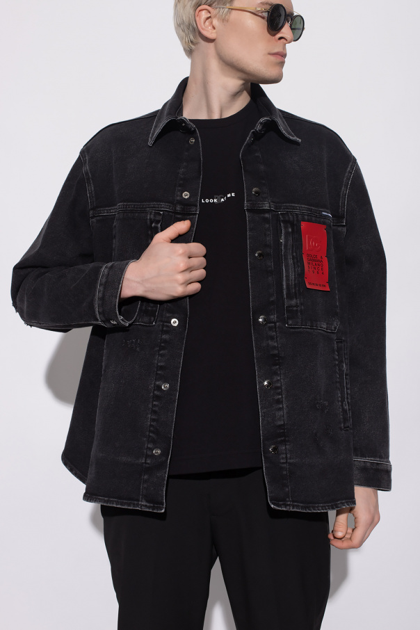 Black distressed denim jacket from Dolce & Gabbana. Fastened with snaps, this garment features a red logo patch, two snap-fastened pockets, two zip pockets and snap-fastened cuffs.