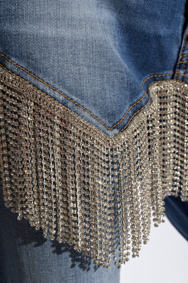 Blue ‘642’ jeans from Dsquared2. Made of cotton, this pair features buttons, five slip pockets, decorative crystal insert and slightly tapered legs.