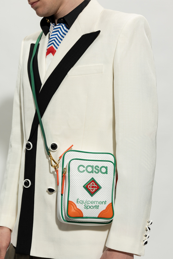 White, orange and green perforated shoulder bag from Casablanca. Made of leather, this model features one internal compartment, front zip pocket, logo print, red monogram appliqué, detachable and adjustable shoulder strap and gold-tone metal hardware.