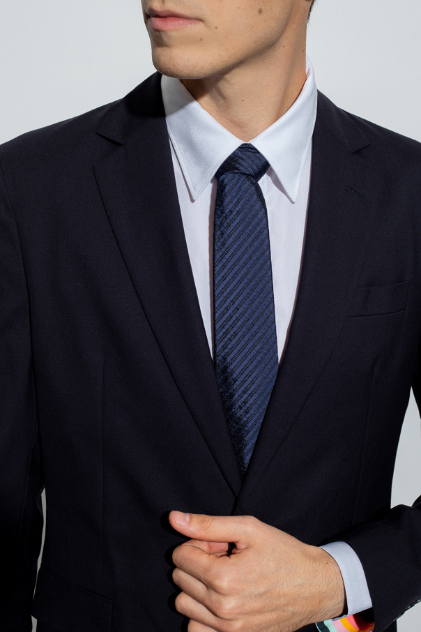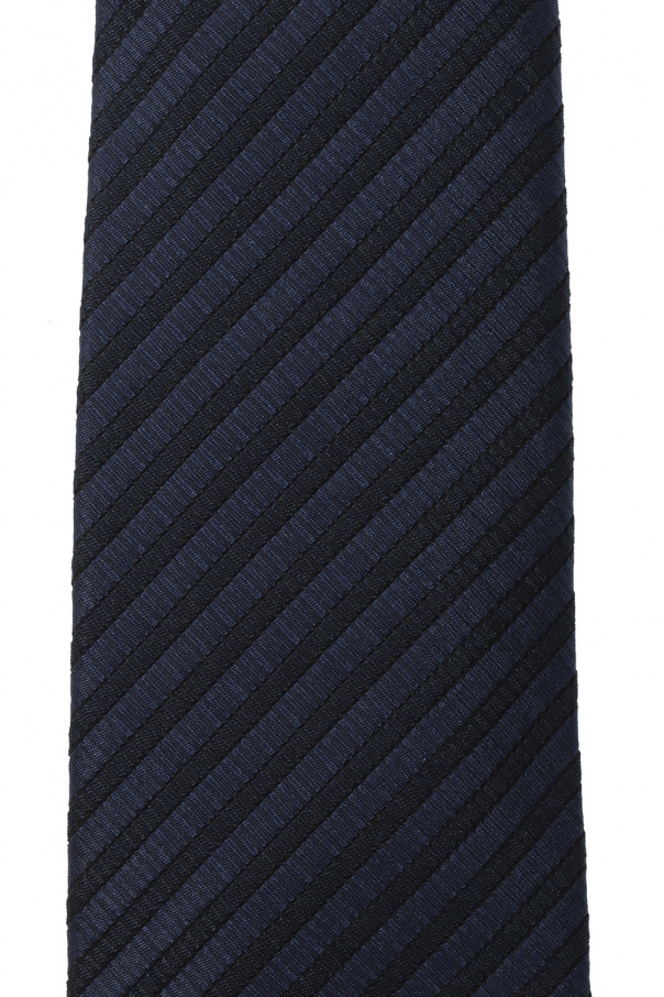 Navy and black tie from Giorgio Armani. Made of silk, this item is decorated with a stripe pattern.
