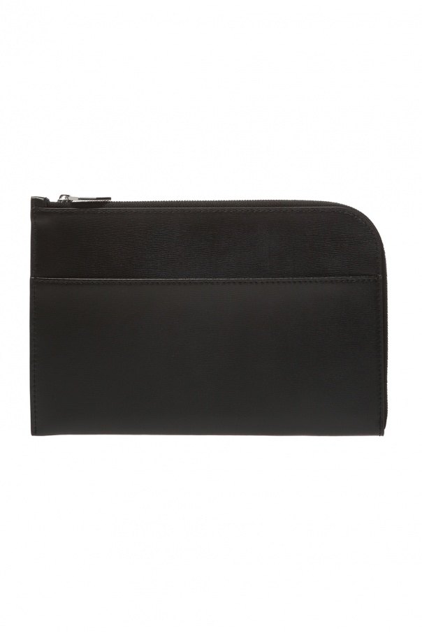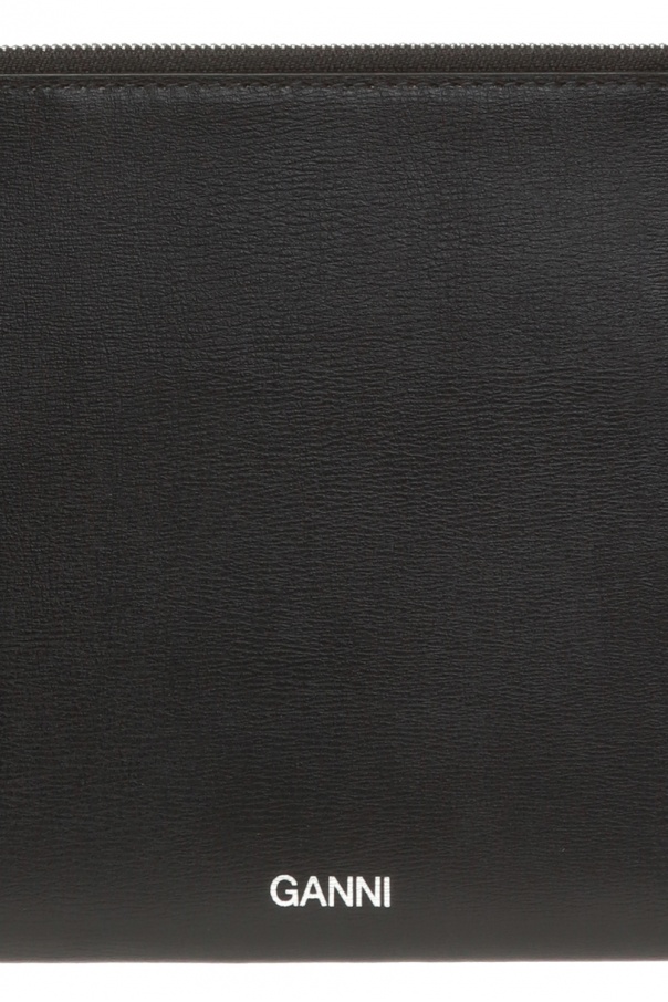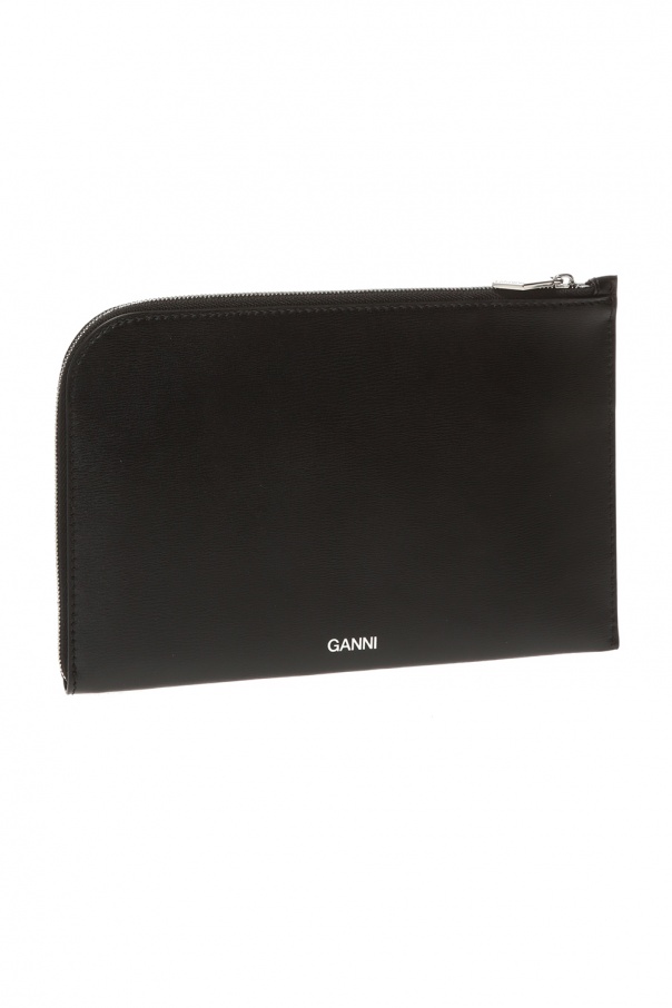 Black clutch from Ganni. Made of leather. Embellished with printed silver-tone logo. Features zip-around fastening, slip pocket on the rear and interior with 1 compartment, 1 slip pocket and 5 card slots inside.