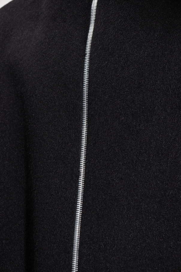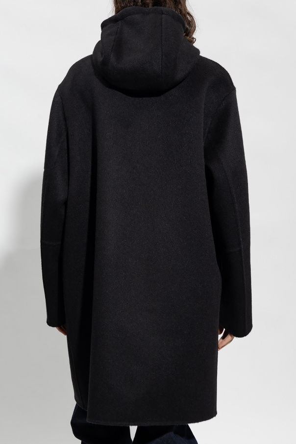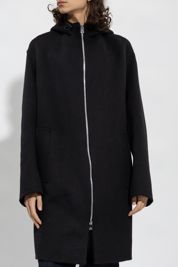 Black coat from Bottega Veneta. Crafted from a blend of brushed wool and mohair, this style features a two-way zip fastening, a drawcord-adjustable hood, two slip pockets and long sleeves.