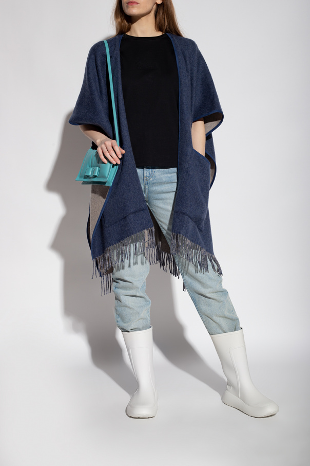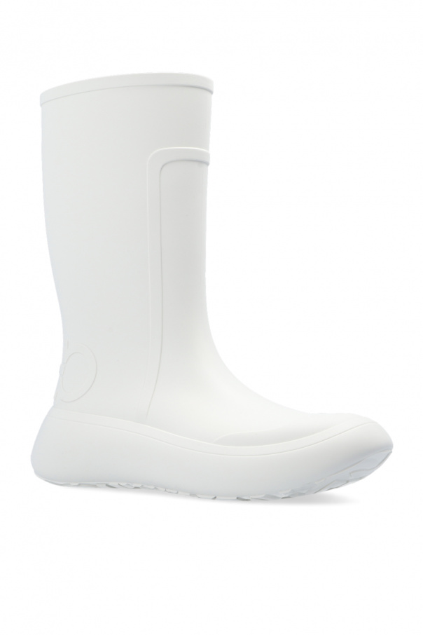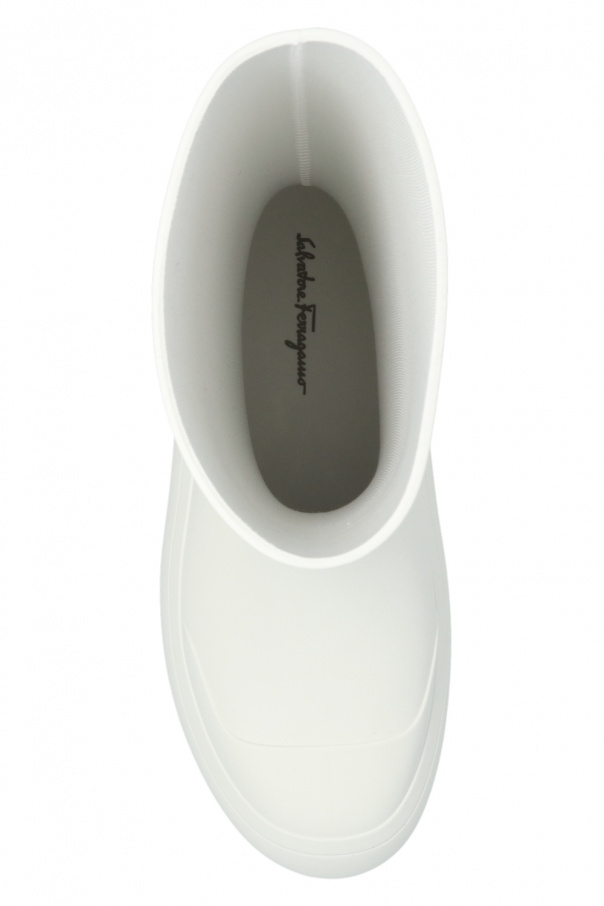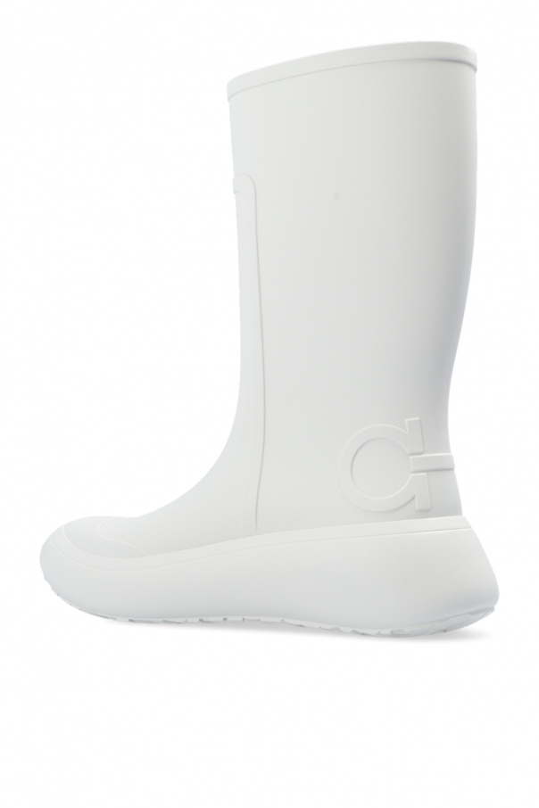White rain boots from Salvatore Ferragamo. Resting on a white rubber sole, this pair features a raised ‘Gancini’ logo.