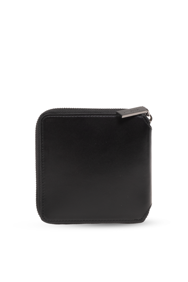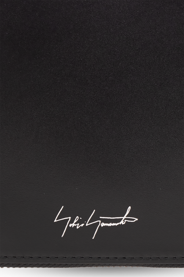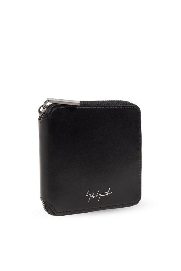 Black wallet from Discord Yohji Yamamoto. Made of leather, this item fastens via a zip and showcases a silver-tone logo on the front as well as one bill compartment, one snap-fastened coin pocket, two slip pockets and four card slots inside.