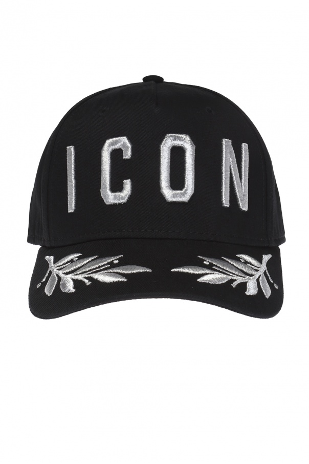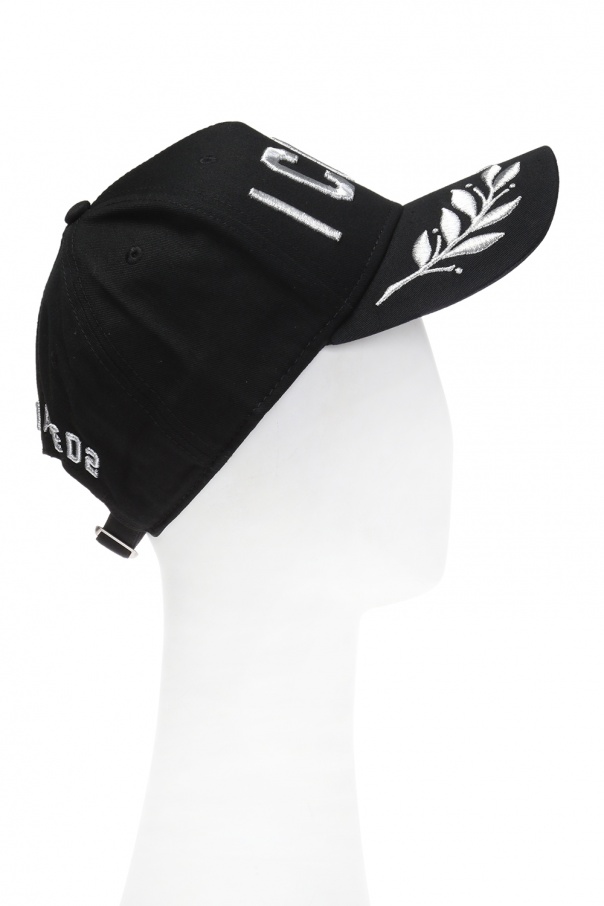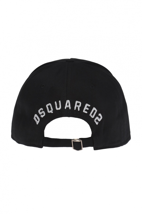 Black baseball cap from Dsquared2. Crafted from cotton, this item features an embroidered pattern and logo in white and an adjustable strap with a silver-tone buckle.