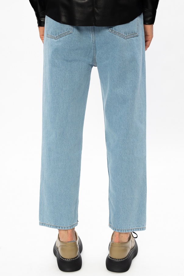 Light blue ‘Connor’ jeans from Nanushka. Falling down with legs that taper towards the ankles, this pair is complete with button fastening, classic five pockets and a brown logo embroidery for the brand recognition.