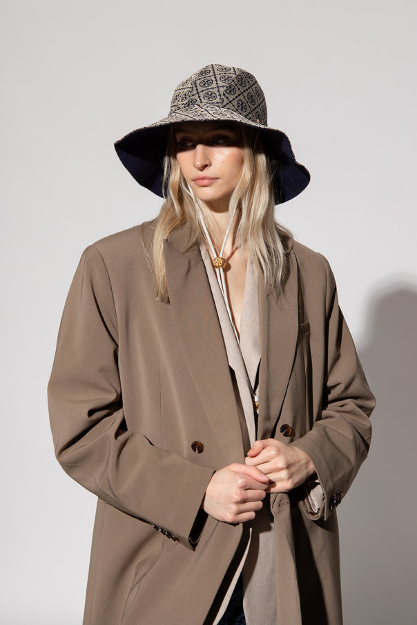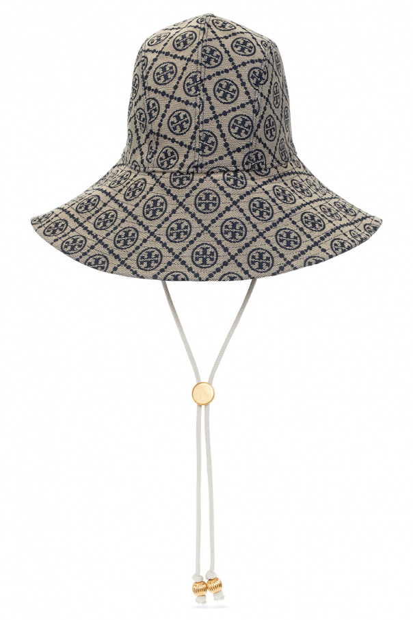 Beige and navy bucket hat from Tory Burch. Crafted from canvas with the T Monogram, a classic pattern inspired by traditional Pennsylvania Dutch quilting.The drawstring cord adjusts with a brass Double T toggle, finished with gold-tone filigree beads.