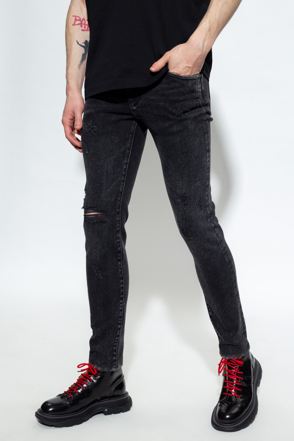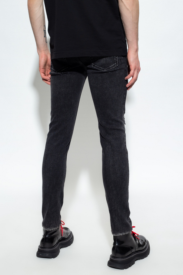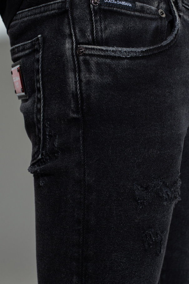 Grey skinny jeans from Dolce & Gabbana. Falling with legs that taper towards the ankles, this pair features a zip fly with a button, classic five pockets, a stonewashed treatment and a black and red logo patch on the back.