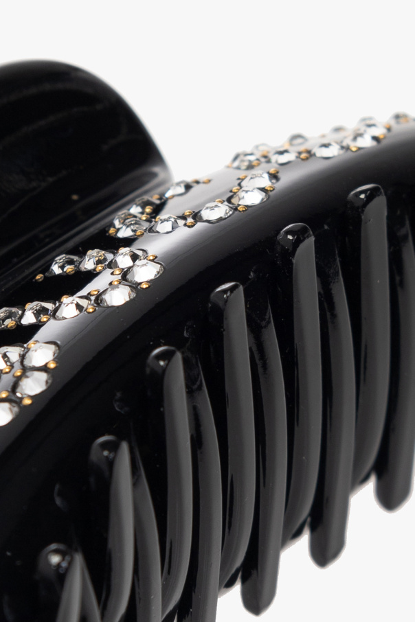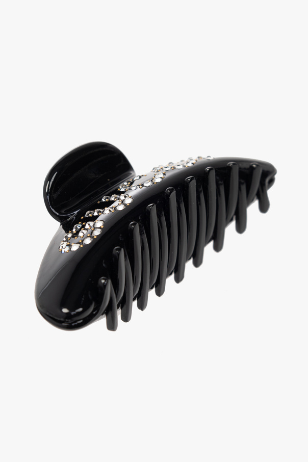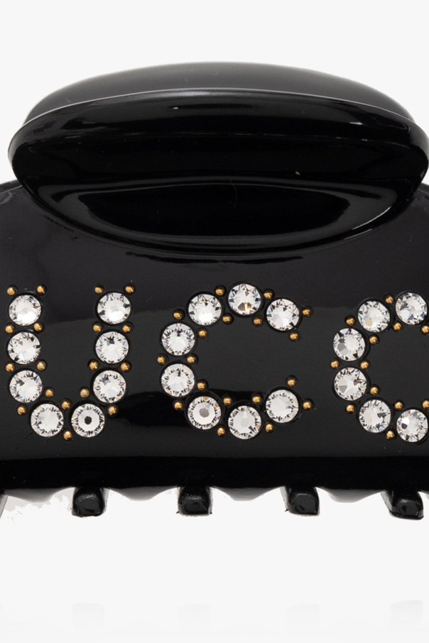 Black hair clip from Gucci. This item showcases the brand's logo composed of glistening crystals.