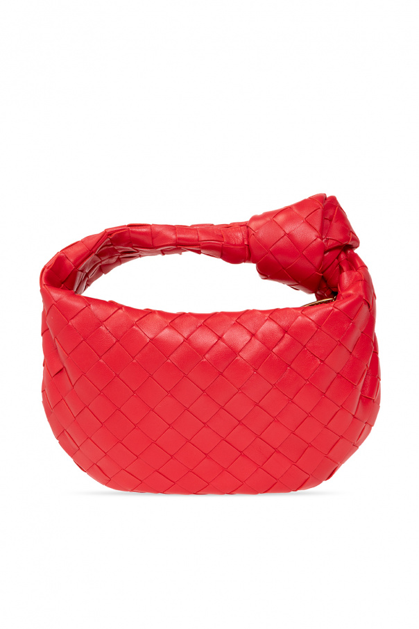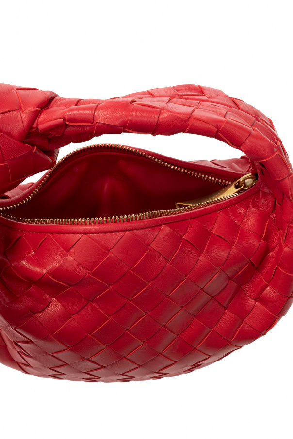 Reddish pink ‘Jodie Mini’ hobo handbag from Bottega Veneta. Crafted from a blend of lamb leather and calf leather, this design secures with a zip and showcases the brand's signature Intrecciato weave, a short handle accentuated with a decorative knot, gold-tone metal hardware and one internal compartment.